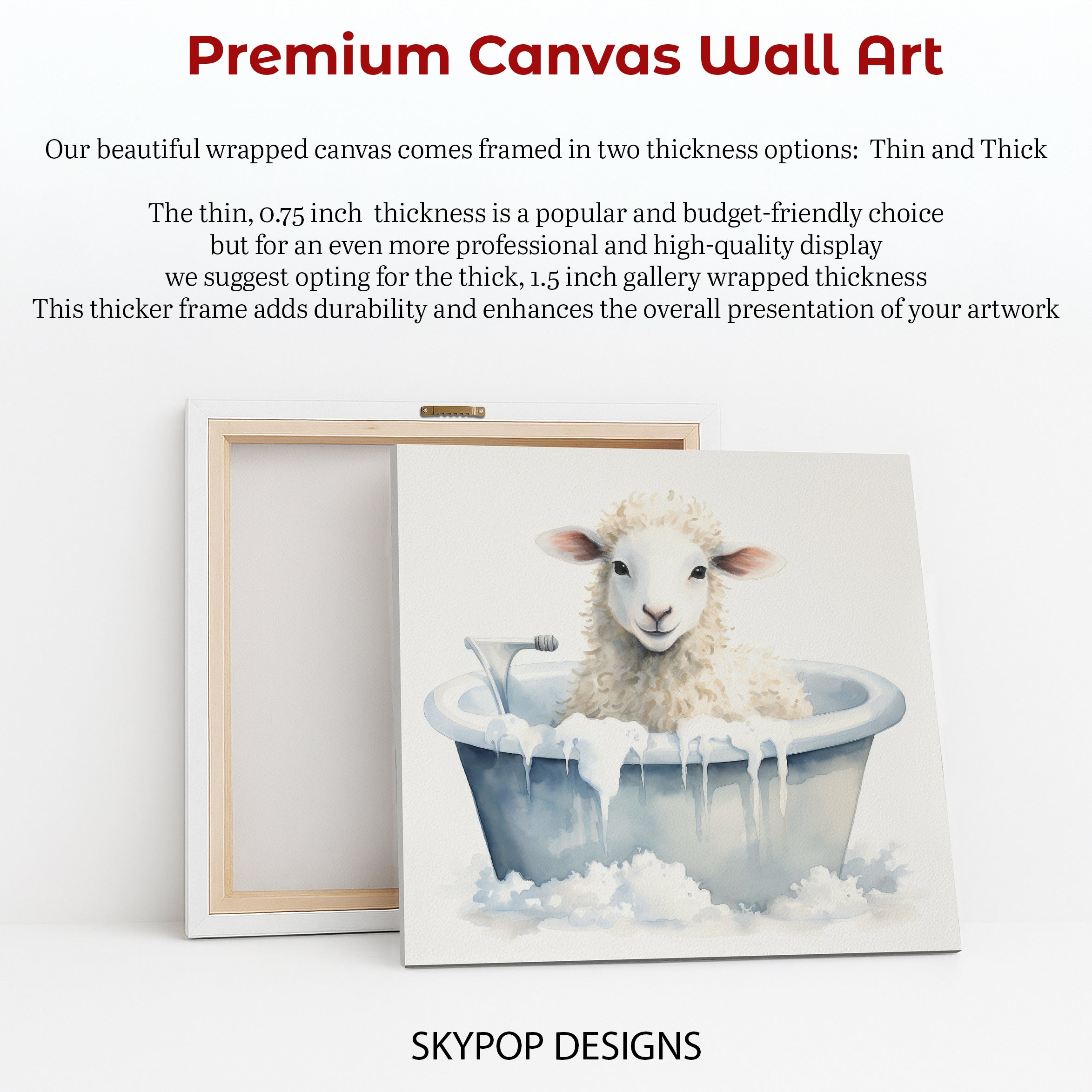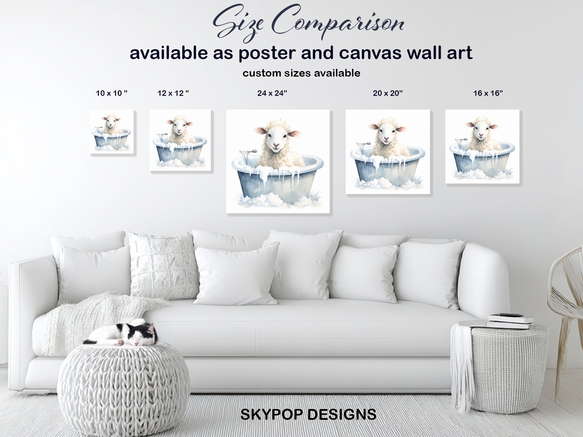 Keywords: Sheep Wall Art, Bathtime Sheep Art, Farmhouse Decor, Rustic Decor, Shabby Chic Decor, Whimsical Art, Animal Art, Nature Art, Children's Room Decor, Nursery Wall Art, Bathroom Art, Living Room Decor, White Sheep Art, Blue Sheep Art, Grey Sheep Art, Multicolor Artwork, Watercolor Art, Canvas Wall Art, Sheep Poster, Farm Animal Art, Housewarming Gift, Birthday Gift, Cozy Home Decor, Inviting Space Art, Peace and Innocence Art, Gentle Pop of Color, Tranquil Atmosphere, Cute Sheep Art, Wall Decor Sheep, Adorable Sheep Art