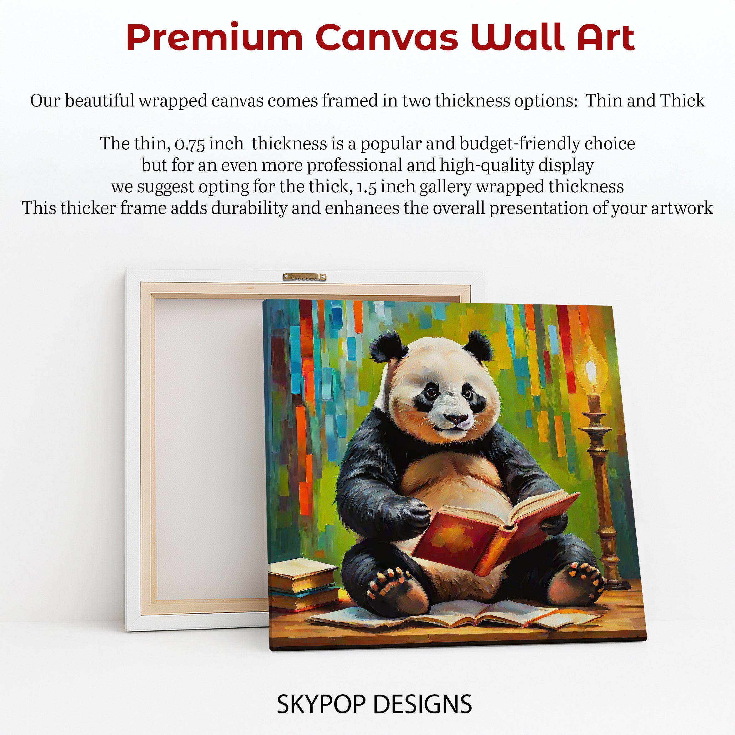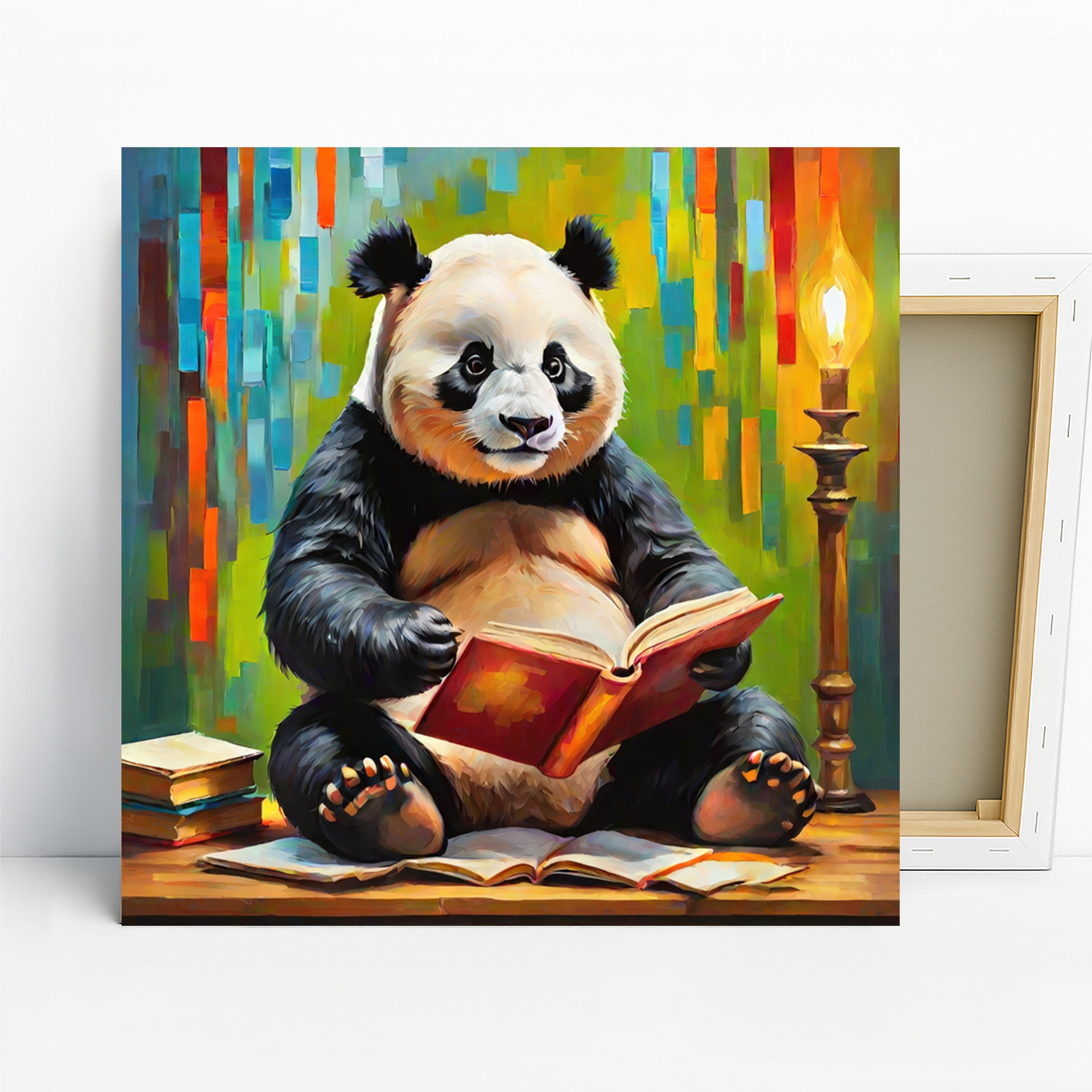 Keywords: Panda canvas art, Animal wall art, Whimsical art, Contemporary art, Bohemian decor, Modern decor, Scandinavian decor, Living room art, Bedroom art, Office wall art, Library decor, Multicolor art, Yellow art, Green art, Orange art, Panda art, Bookworm art, Canvas print, Wall art poster, Home decor, Interior design, Statement piece, Gift for book lovers, Housewarming gift, Birthday gift, Holiday gift, Playful art, Cheerful art, Study decor, Animal print