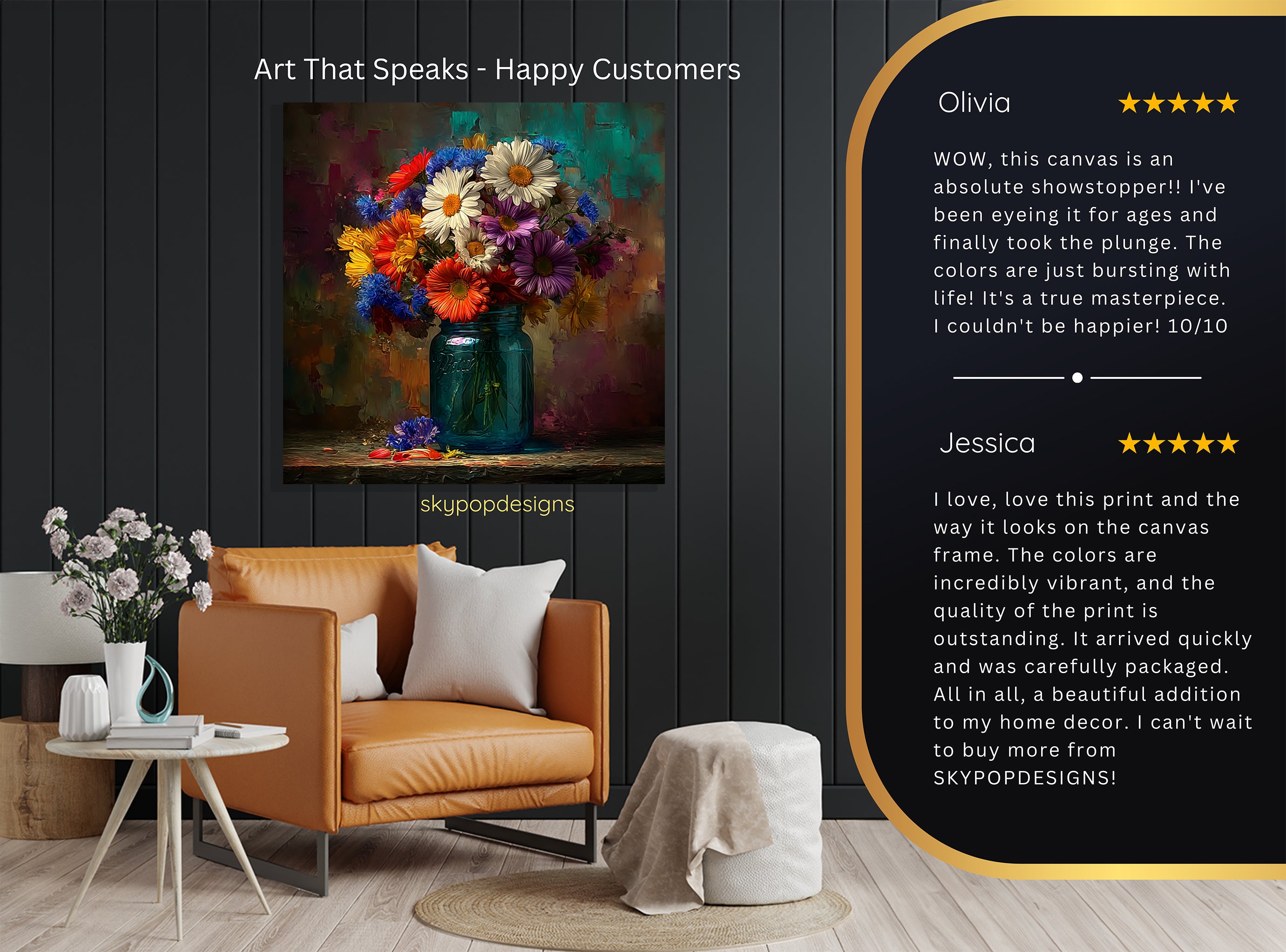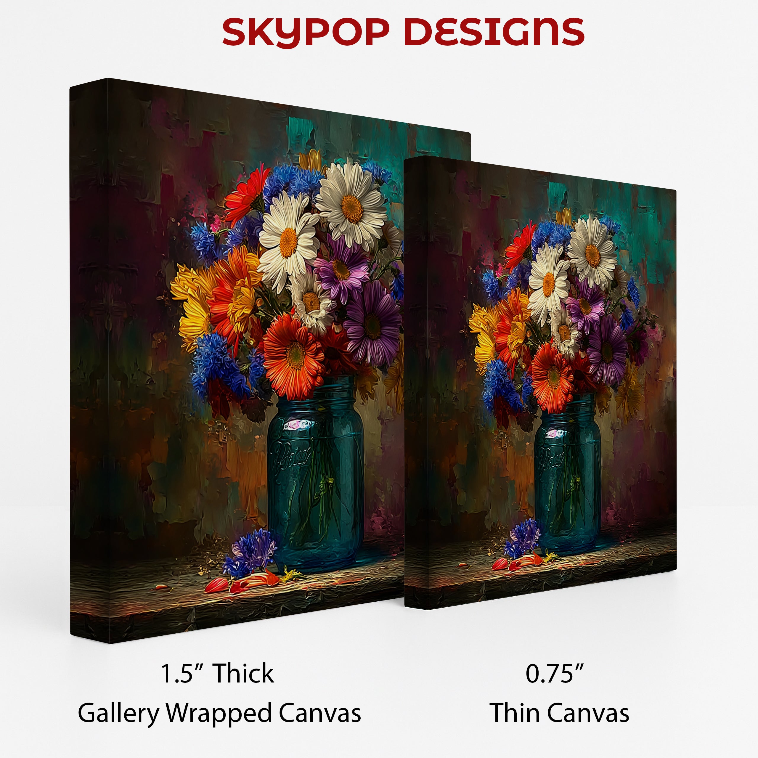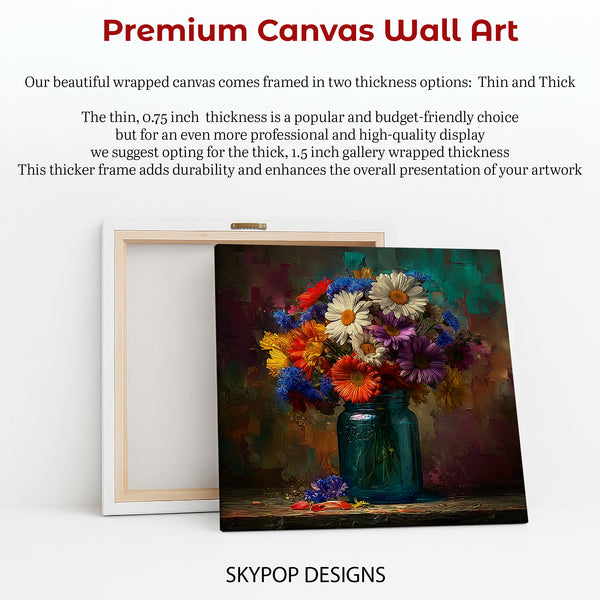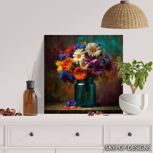 Elevate your home with this stunning floral canvas wall art that brings the beauty of nature indoors. Featuring a vibrant bouquet of daisies and colorful wildflowers in a rustic teal mason jar, this artwork captures the essence of a fresh garden bloom. The impressionistic style and rich, multicolor palette create a captivating focal point, perfect for transforming any living room, bedroom, or kitchen. Our high-quality canvas wall art or poster enhances your space with its striking visual appeal and the cheerful mood it inspires. Ideal for those embracing bohemian or farmhouse decor styles, this piece adds a touch of timeless charm and natural beauty. The blend of vibrant colors, including bright yellows and reds, evokes feelings of joy and warmth, making it a delightful addition to your wall decor. Showcase your love for flowers with this exquisite piece, a perfect gift for housewarmings, birthdays, or holidays to bring lasting beauty and inspiration. This versatile wall art is available in various sizes to perfectly fit your desired display space, whether you're looking to create a cozy farmhouse feel or a vibrant bohemian sanctuary. Transform your interior with the lasting elegance and vibrant artistry of this exquisite floral canvas poster, a true celebration of nature's artistry. Add a touch of lively color and artisanal charm to your home today with this gorgeous flower art.