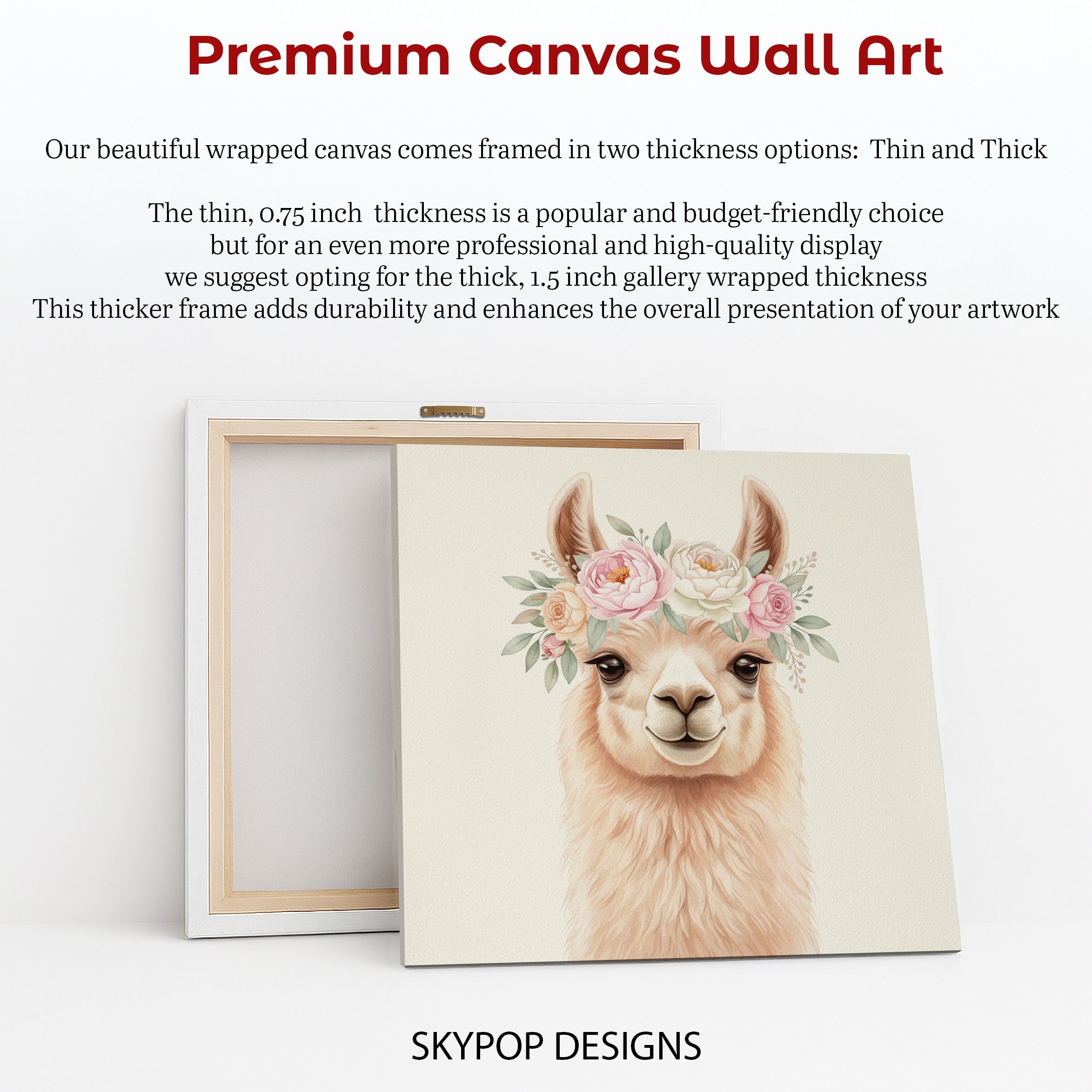 Transform your room with this enchanting llama canvas wall art, showcasing a charming llama adorned with a delicate floral crown. This whimsical animal art piece, presented as a captivating poster or stunning canvas wall art, brings a touch of nature's beauty and bohemian spirit into your home. The soft pink and white peonies, complemented by subtle green foliage, create a vibrant yet serene focal point that enhances any space. Perfect for a child's room, nursery, or a cozy bedroom, this artwork adds a touch of playful elegance. Its inviting colors and gentle subject matter are ideal for farmhouse or shabby chic decor, infusing warmth and personality. This high-quality canvas art celebrates the joy of simple pleasures, making it a delightful addition to your wall decor collection. Ideal as a thoughtful gift for birthdays or housewarmings, this llama print is sure to bring smiles. Elevate your home with this uniquely captivating artwork that adds a fresh, natural feel to your living room or entryway. Celebrate life's sweeter moments with this beautiful llama poster, a perfect blend of art and nature. This eye-catching canvas wall art will inspire joy and tranquility wherever it's displayed, making your space feel more vibrant and welcoming. Add this beautiful floral llama artwork to your decor today and enjoy its cheerful charm.