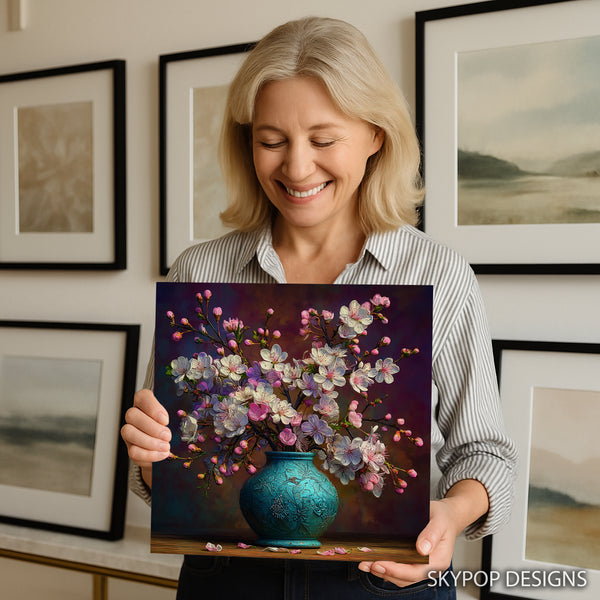 Keywords: cherry blossom art, canvas wall art, floral art, impressionism art, still life art, pink cherry blossoms, white cherry blossoms, teal vase art, living room art, bedroom art, dining room art, entryway art, contemporary decor, farmhouse decor, traditional decor, spring wall art, natural elegance, home decor, wall decor, wall poster, housewarming gift, birthday gift, holiday gift, floral print, decorative vase, art for home, inspiring art, delightful decor, vibrant colors, blooming branches