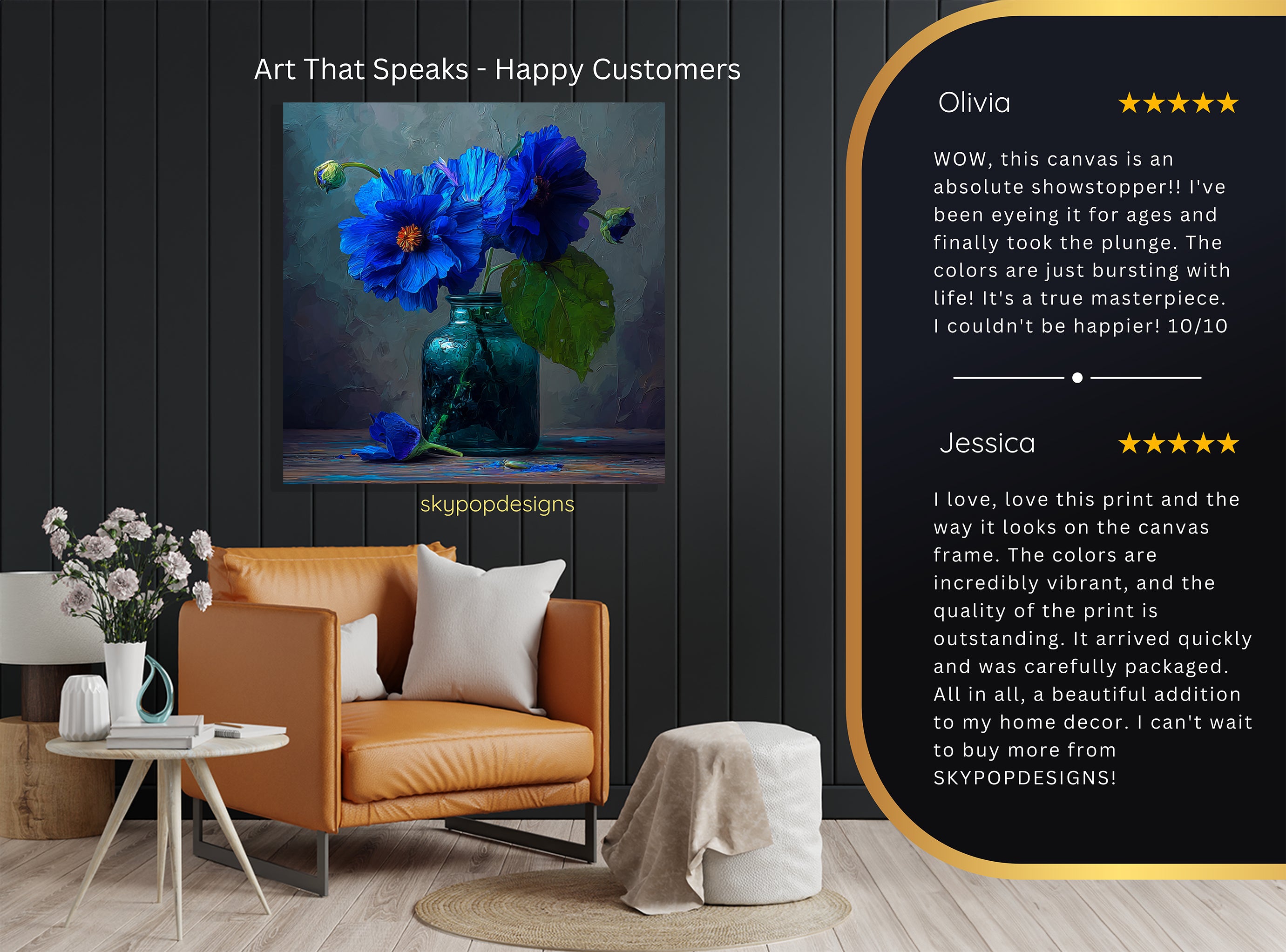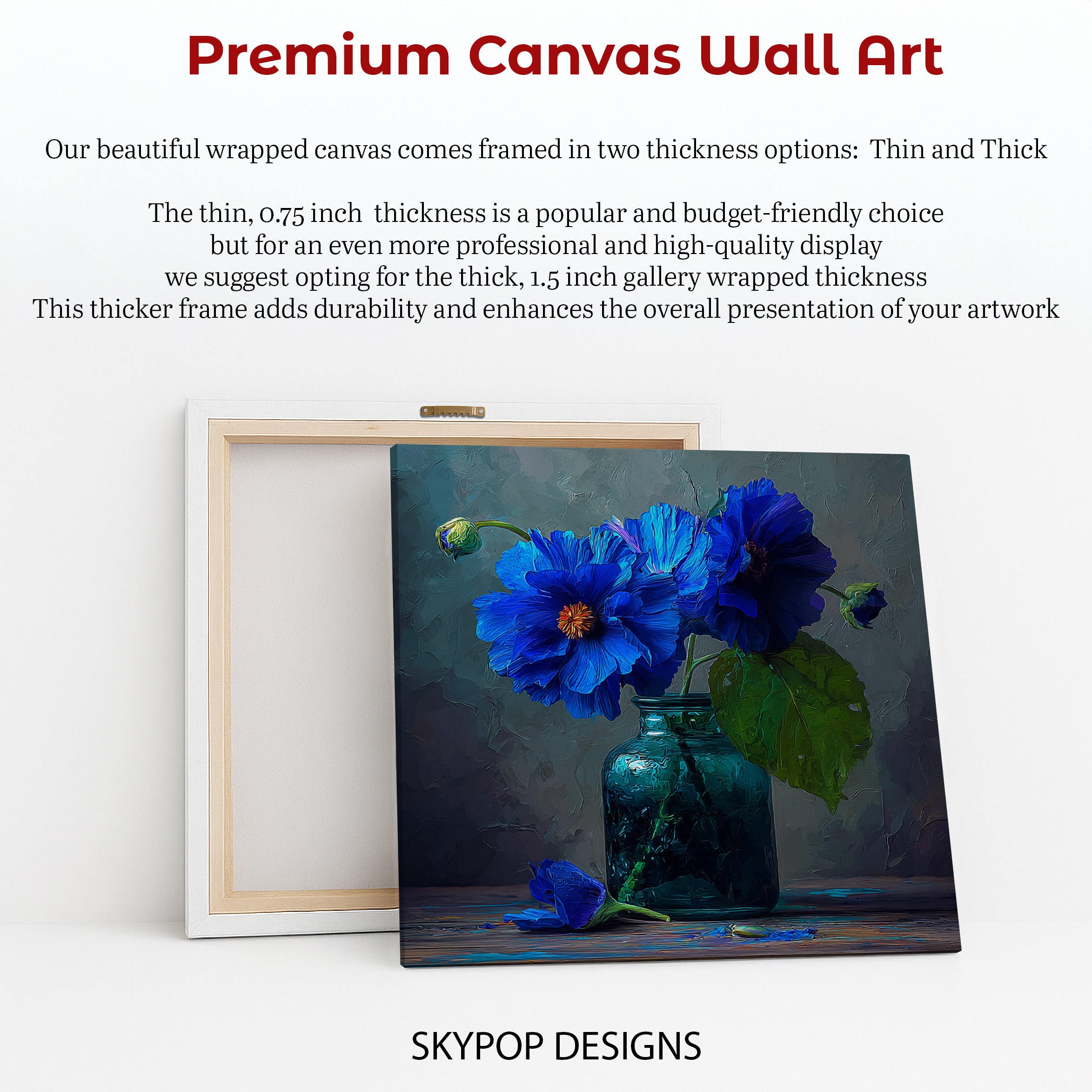 Transform your living space with this striking blue floral canvas wall art. This captivating still life poster showcases vibrant blue flowers in a rustic glass vase, bringing a splash of dramatic color and natural beauty to any room. The rich blue hues evoke a sense of tranquility and sophistication, perfect for creating a calming atmosphere in your bedroom or energizing your office space. This authentic canvas wall art piece is ideal for contemporary, modern, or minimalist decor styles, seamlessly blending with existing interior designs. The textured brushstrokes and deep, moody background add depth and artistic flair, making this poster a true statement piece. Whether you're looking to elevate your living room or add a touch of elegant nature art to your dining room, this artwork delivers. It serves as a stunning focal point and is an excellent choice for housewarming gifts or to refresh your home decor. Experience the beauty of nature captured in high-quality canvas wall art that is sure to inspire. Add this breathtaking piece to your collection and transform your home into a sanctuary of style. Brighten your walls with this gorgeous floral poster today. Make your home decor pop with this stunning blue accent.