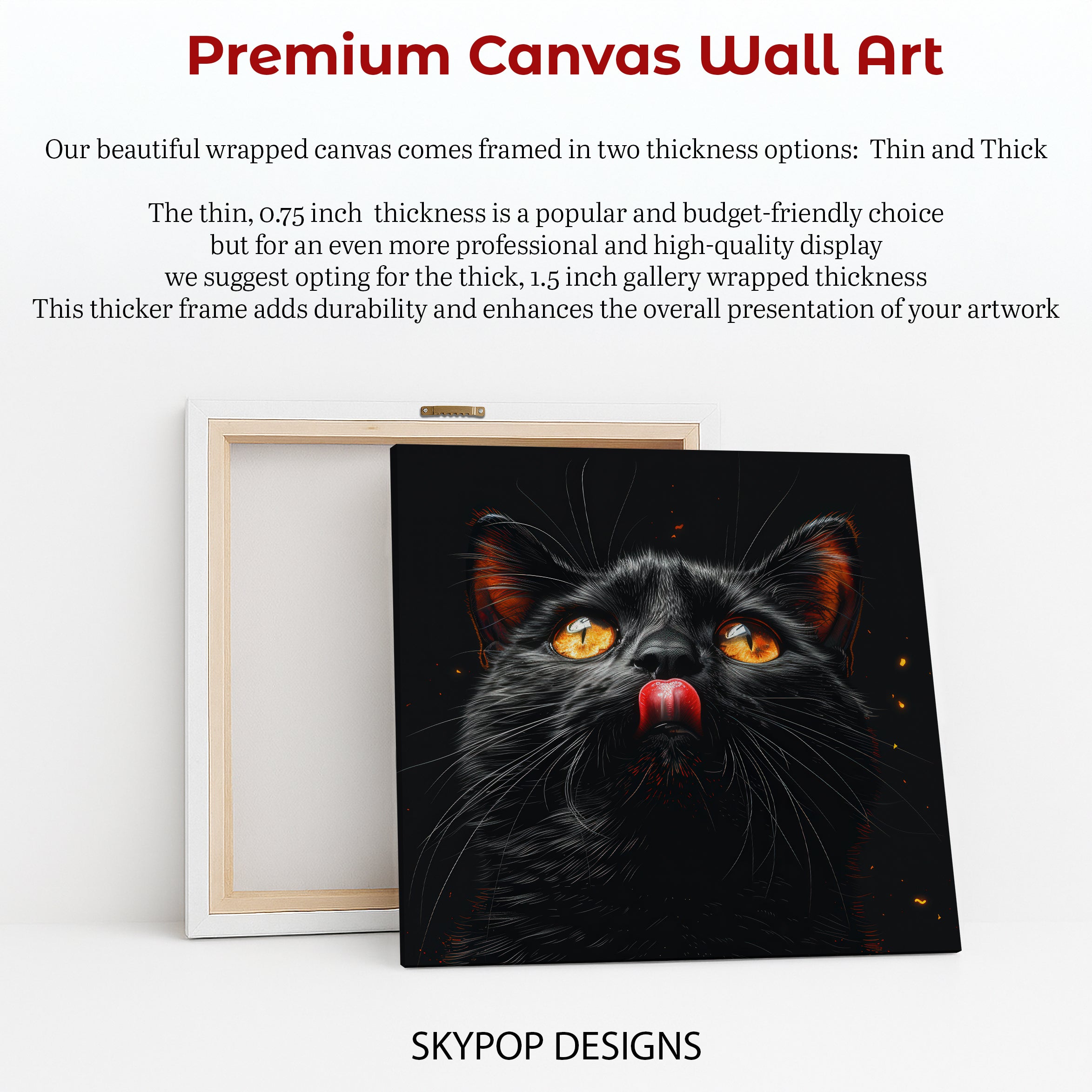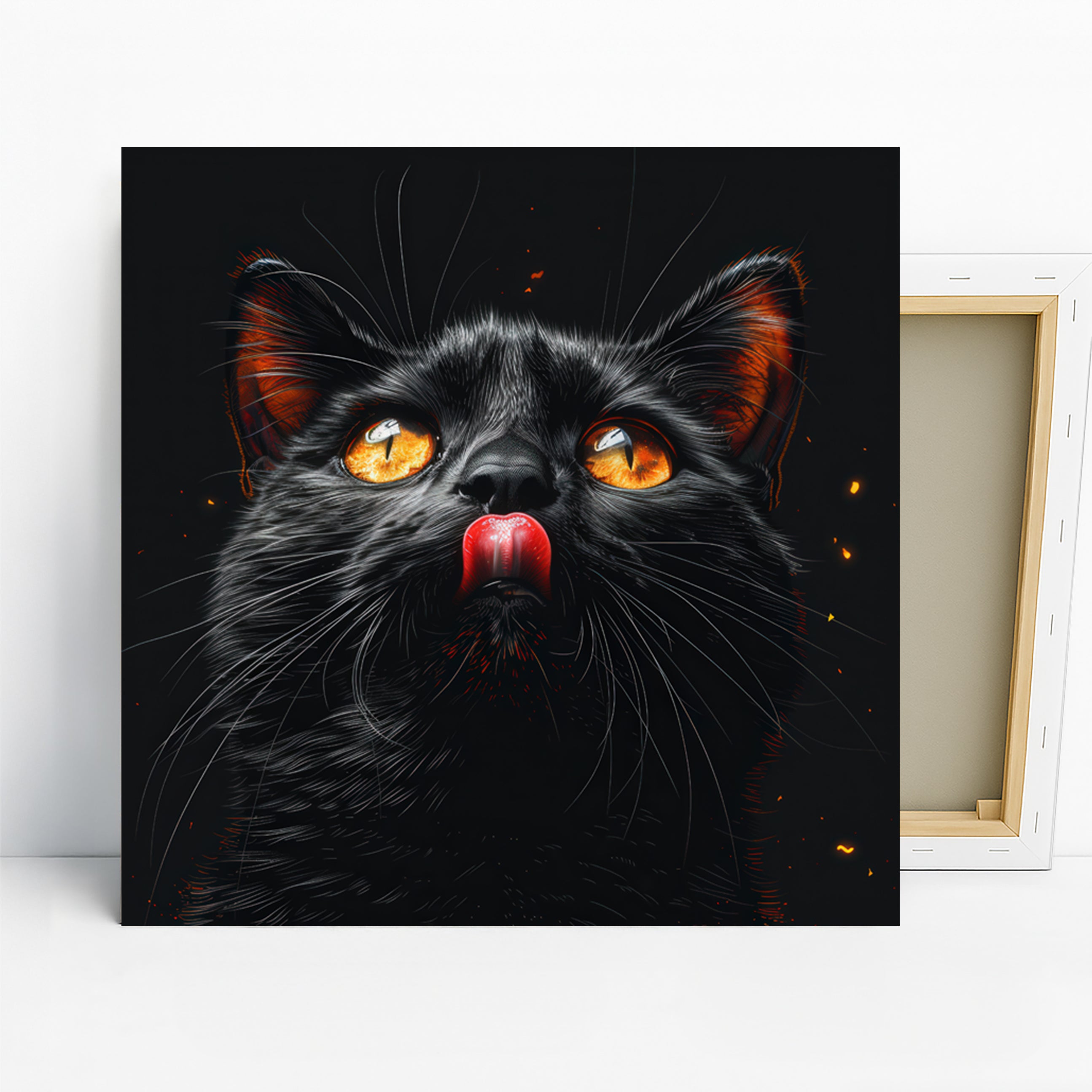 Transform your space with this striking black cat canvas wall art, featuring a captivating close-up of a feline licking its lips with vibrant orange eyes. This unique poster art offers a bold statement piece that will elevate any modern or minimalist decor. The abstract styling and dramatic contrast between the black fur, fiery orange accents, and bright yellow eyes create a visually stunning appeal, perfect for living rooms, bedrooms, or even a stylish office. This animal art piece embodies a sense of mystery and playful energy, adding a touch of glam to your home. The detailed brushwork and high-quality print ensure this canvas wall art is a conversation starter, ideal for those who appreciate contemporary animal-themed decor. It's a fantastic gift for any cat lover, suitable for housewarmings, birthdays, or holidays. This versatile wall art complements various color schemes and enhances room aesthetics, bringing a sophisticated yet edgy vibe. Make a bold statement and celebrate the allure of cats with this unforgettable piece of canvas art. Elevate your home's atmosphere with this trendy and eye-catching wall decor that's sure to impress.