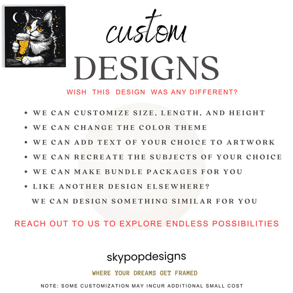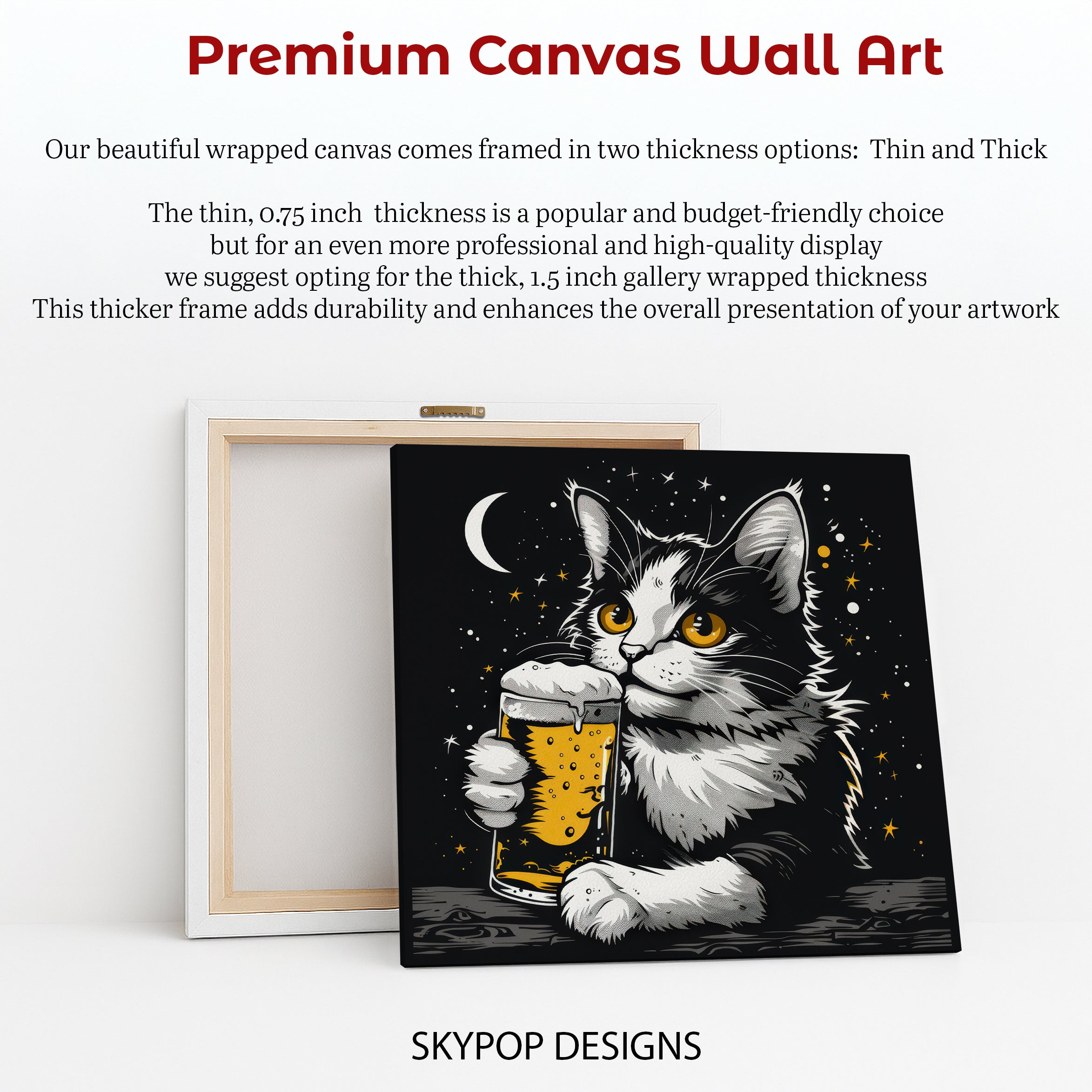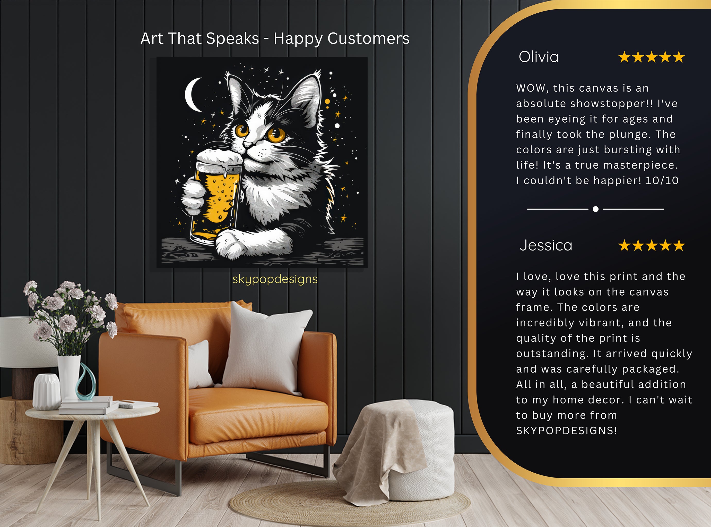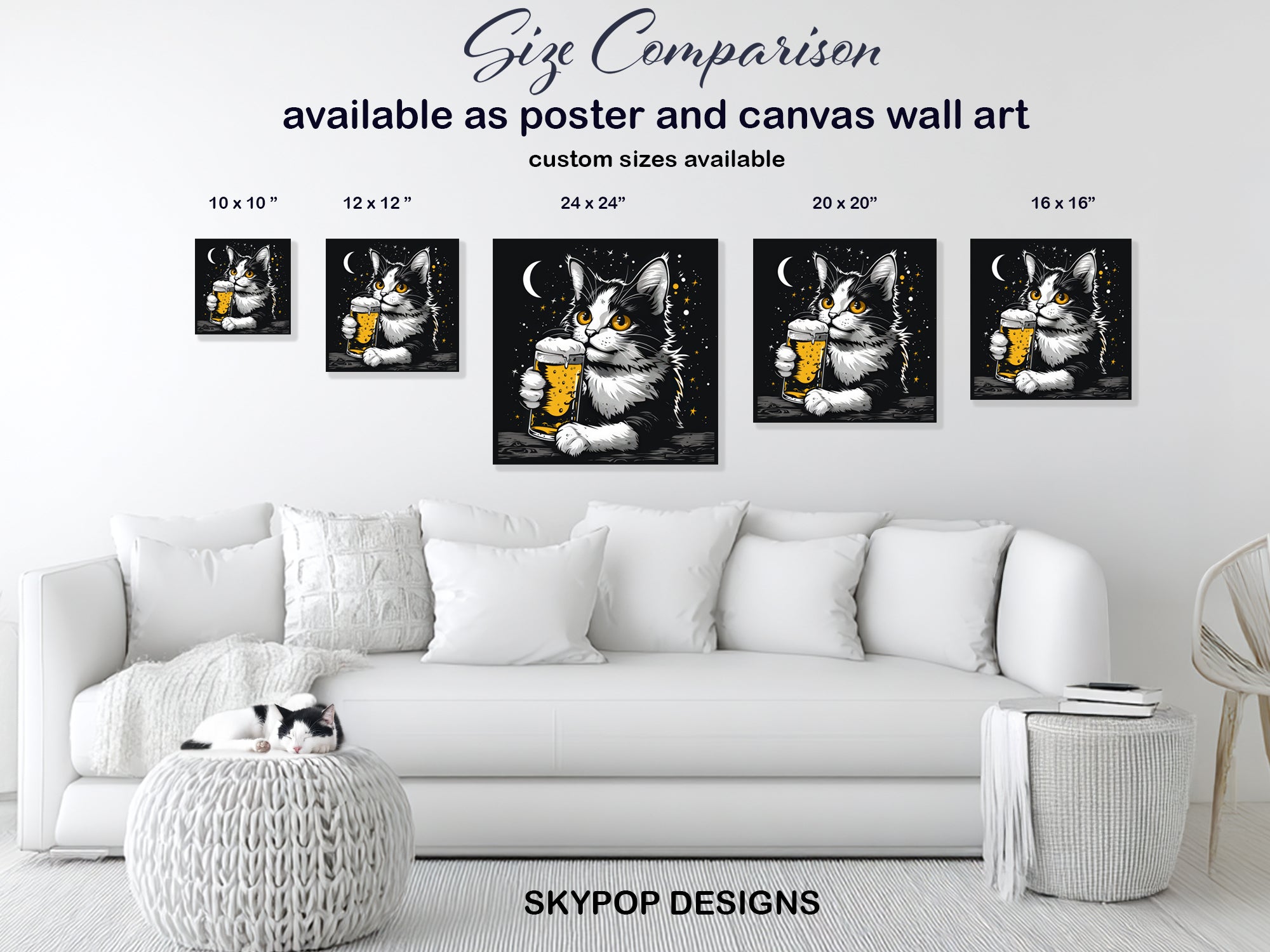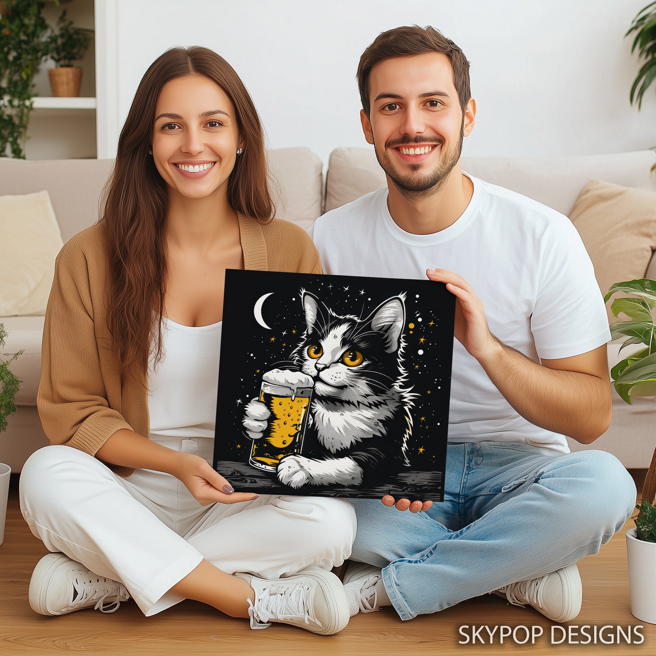Transform your space with this captivating cat canvas wall art, featuring a stylish cat enjoying a refreshing beer under the starry night sky. The bold lines and striking black and white palette with pops of yellow create a humorous and eye-catching focal point. This unique poster or canvas wall art is perfect for modern living rooms, game rooms, or any space that needs a touch of personality. The whimsical yet modern design elevates any decor style, from contemporary to minimalist. The image of a cat with a beer evokes a sense of leisure and good times, making it ideal for bar areas or kitchens. High-quality printing ensures the vibrant details of the cat's fur and the frothy beer shine through. This versatile artwork adds a cool and playful vibe to your home. It is a great gift for cat lovers, beer enthusiasts, or anyone looking to add a unique piece of wall decor. Elevate your home's atmosphere with this fun and quirky blend of pop art and animal art. Make this memorable cat artwork the centerpiece of your collection today.