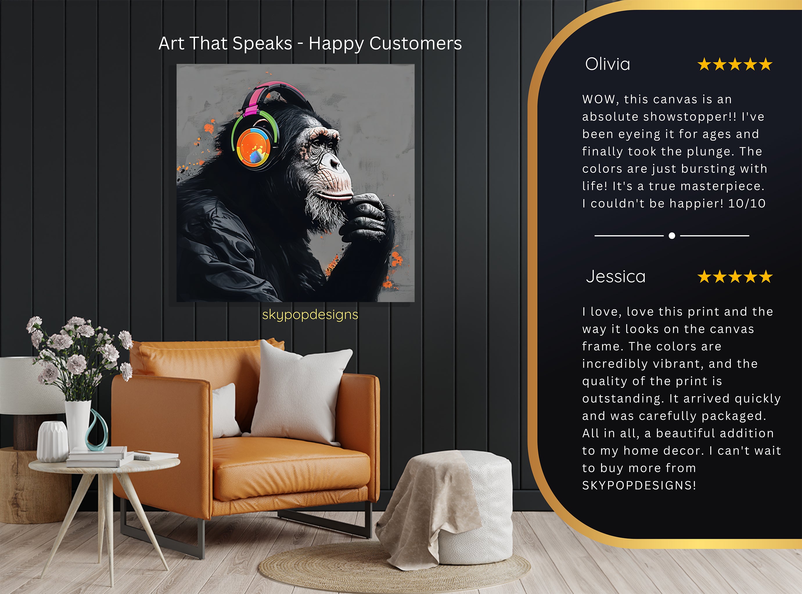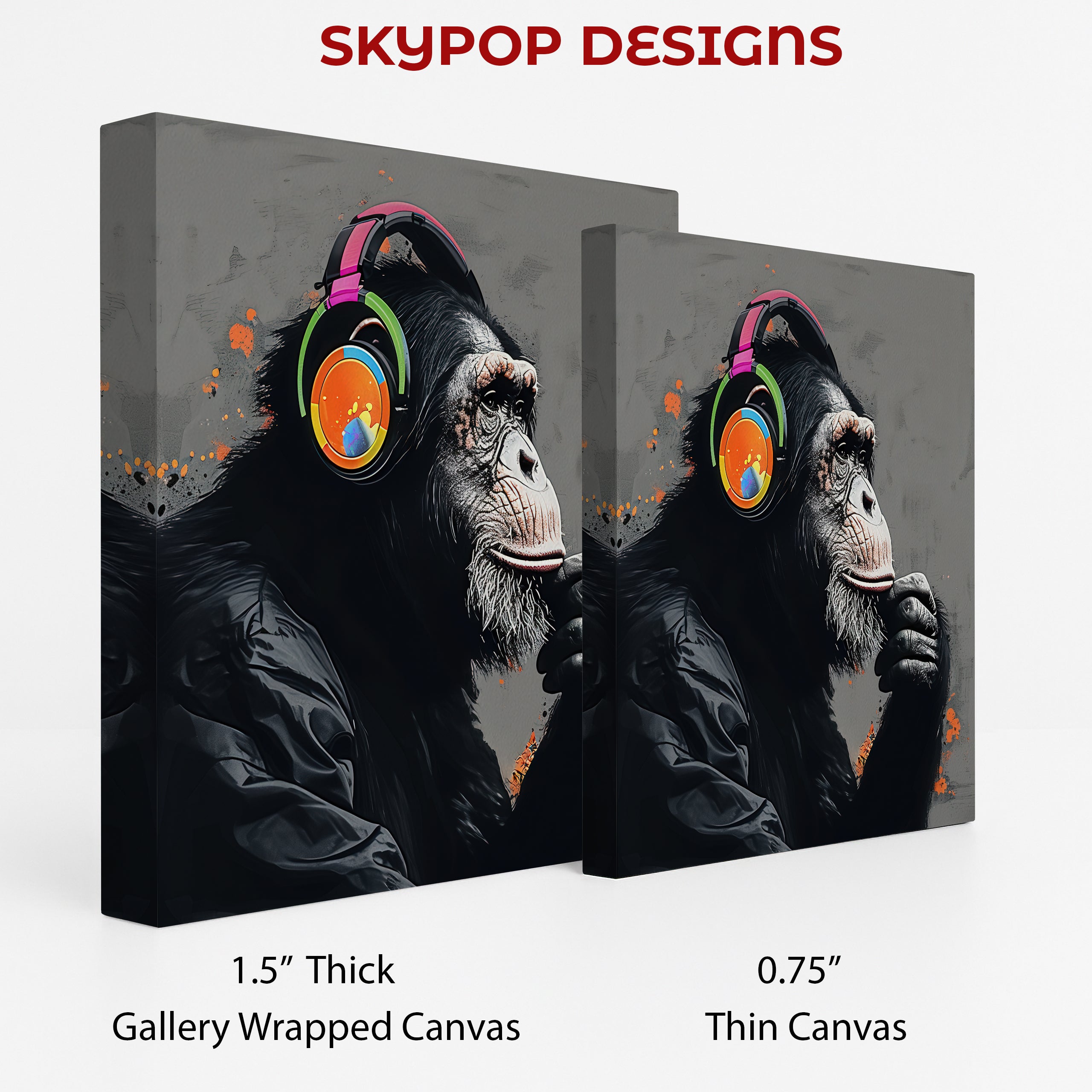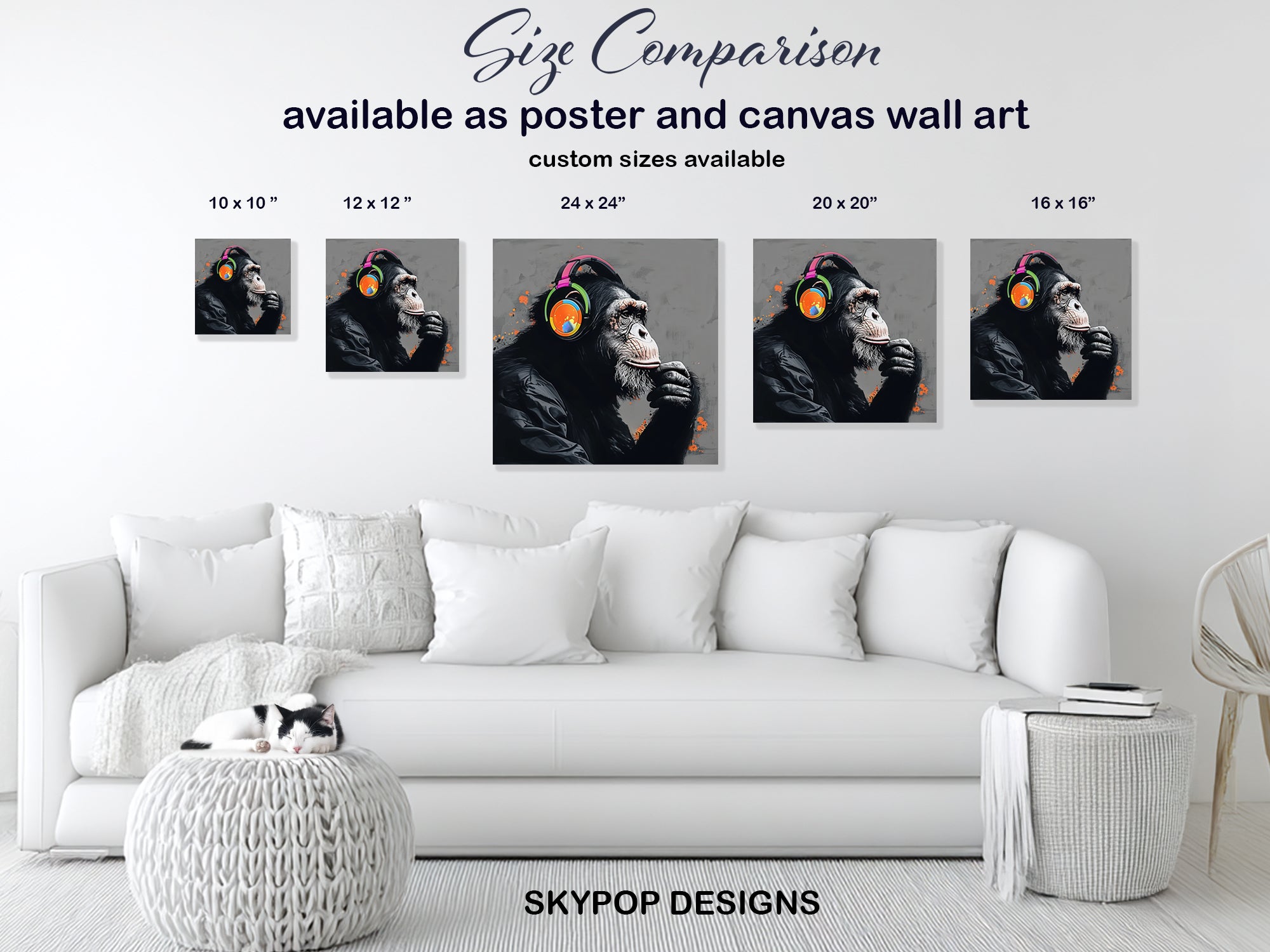 Keywords: Chimpanzee Wall Art, Canvas Art, Pop Art, Street Art, Contemporary Art, Modern Decor, Eclectic Decor, Urban Vibe, Living Room Art, Office Decor, Bedroom Art, Game Room Art, Multicolor Art, Black and Grey Art, Orange Accent, Chimpanzee Poster, DJ Headphones Art, Music Lover Gift, Primate Art, Animal Wall Art, Statement Piece, Unique Artwork, Home Decor, Wall Decor, Conversation Starter, Creative Inspiration, High-Quality Print, Abstract Art, Masculine Decor, Man Cave Decor