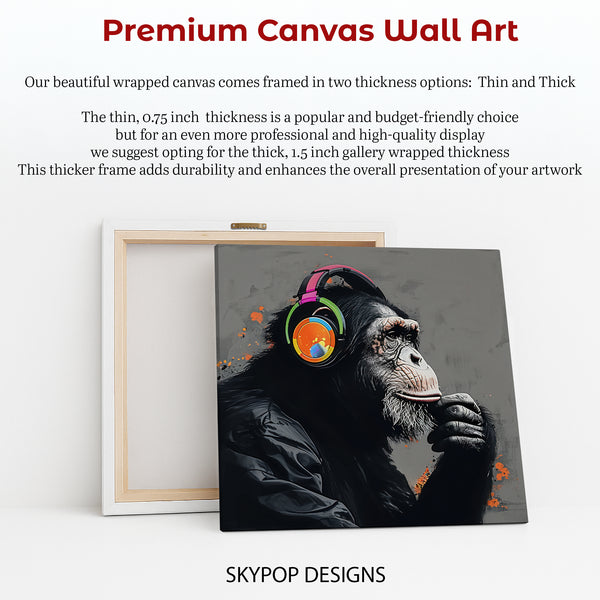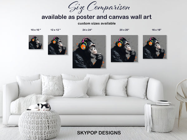 Transform your space with this striking chimpanzee canvas wall art, featuring a cool chimpanzee rocking vibrant headphones. This eye-catching poster is perfect for any modern or eclectic living room, bringing a unique urban vibe to your walls. The fusion of contemporary art styles with pop art elements makes this chimpanzee artwork a true statement piece, ideal for offices or bedrooms needing a touch of personality. The bold, multicolor headphones pop against the sophisticated grey and black backdrop, creating a captivating visual that inspires energy and creativity. This canvas wall art is more than just decor; it’s a conversation starter that celebrates individuality and modern culture. Enhance your gaming room or man cave with this cool chimpanzee poster that adds a dynamic edge to any space. The abstract splash of orange paint adds depth and artistic flair, making this piece a standout in any art collection. High-quality printing ensures every detail of the chimpanzee's expression and the headphone design is rendered beautifully on this canvas art. Perfect as a unique gift for music lovers or primate enthusiasts, this versatile wall art complements various decor styles. Elevate your home atmosphere and display this captivating chimpanzee artwork today. This poster is a fantastic way to showcase your appreciation for distinctive wall decor.
