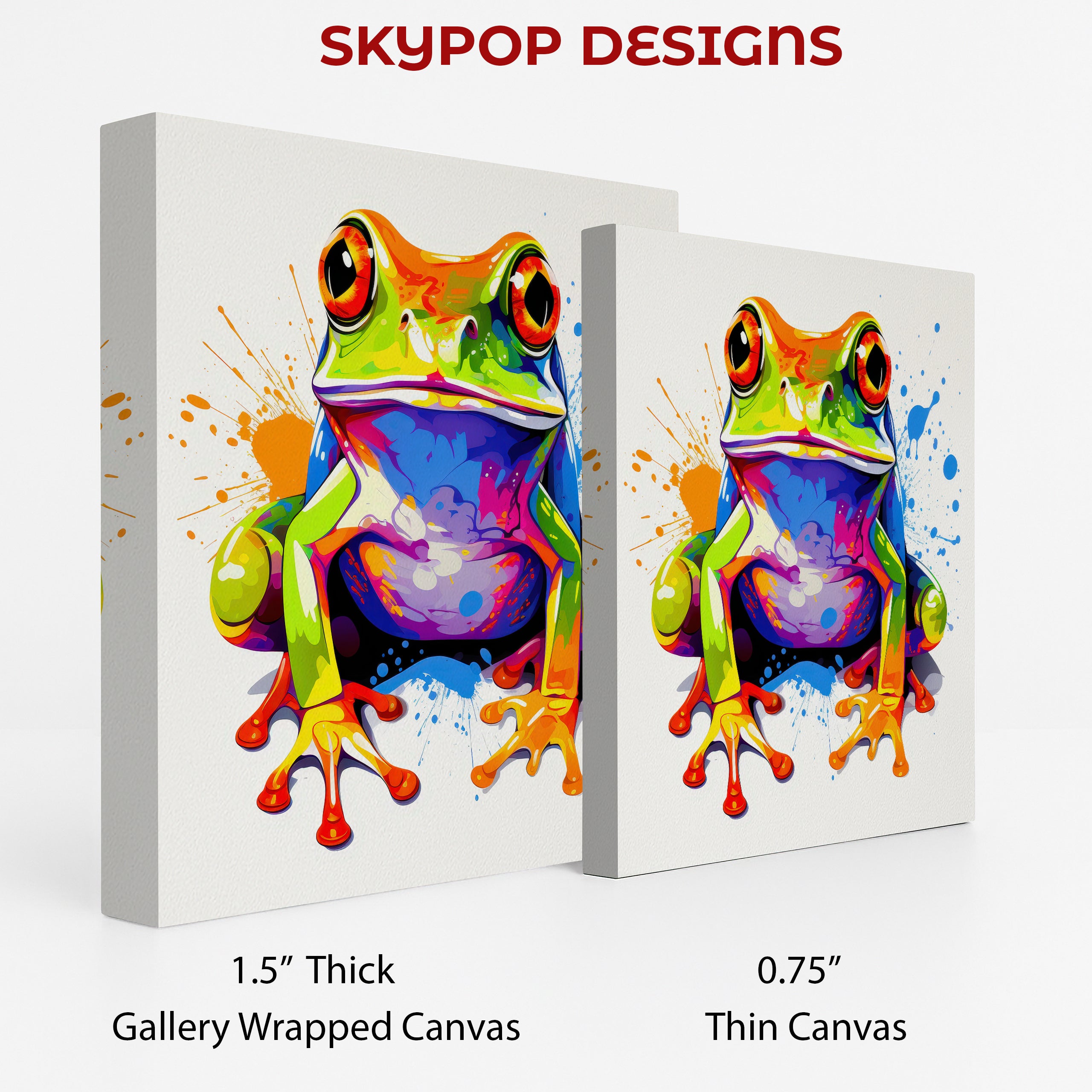 Transform your living space with this eye-catching frog splash canvas wall art. This vibrant and modern poster features a stylized frog rendered in bold, multicolor hues, set against a white background with energetic paint splatter accents in blue and orange. The striking pop art style of this frog canvas art will elevate your home decor.