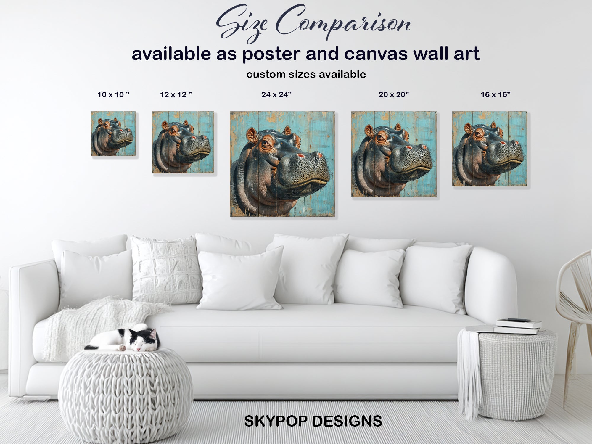 Hippopotamus Art, Canvas or Poster, Contemporary Rustic Decor, Living Room Bedroom Office Entryway Wall Art, Teal Brown Multicolor Black