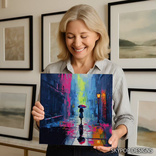 Transform your space with this captivating rainy evening cityscape canvas wall art rendered in a vibrant impressionistic style. The dynamic brushstrokes and bold color palette of blues, pinks, and yellows create a striking and emotional scene that will elevate any room. This stunning poster or canvas wall art captures the mood of a rainy city night, perfect for adding a touch of urban sophistication to your living room or a cozy, inspiring atmosphere in your bedroom. The interplay of light and shadow from the streetlamp reflecting on the wet pavement adds depth and intrigue to this piece. Ideal for contemporary and bohemian decor styles, this artwork is a conversation starter that adds personality and warmth to your home. Its abstract qualities and rich colors can evoke feelings of introspection and tranquility, making it a great addition for your home office or entryway. This versatile canvas wall art is perfect for those who appreciate modern art and are looking to create a vibrant yet cozy ambiance. High-quality printing ensures the details and colors pop, making this a statement piece for any wall. Whether you're looking for a unique gift or want to enhance your current decor, this cityscape art is a fantastic choice. Elevate your home with this unique blend of urban grit and artistic flair. Make this captivating artwork the focal point of your wall decor today.