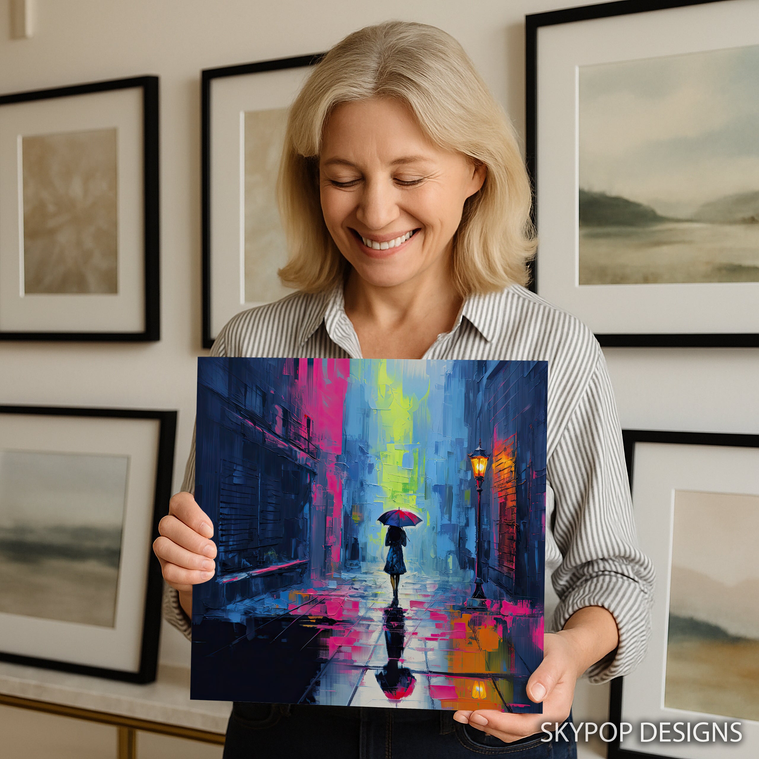 Keywords: Canvas wall art, Abstract art, Contemporary art, Street art, Modern decor, Bohemian decor, Living room art, Bedroom decor, Entryway art, Office wall art, Blue artwork, Multicolor art, Pink and yellow art, Rainy cityscape, City night art, Urban art, Impressionist art, Dynamic brushstrokes, Vibrant colors, Emotional artwork, Home decor, Wall decor, Statement piece, Unique art, Modern art print, Cozy atmosphere, Inspiring art, Gift for art lover, Home office decor, Wall art poster