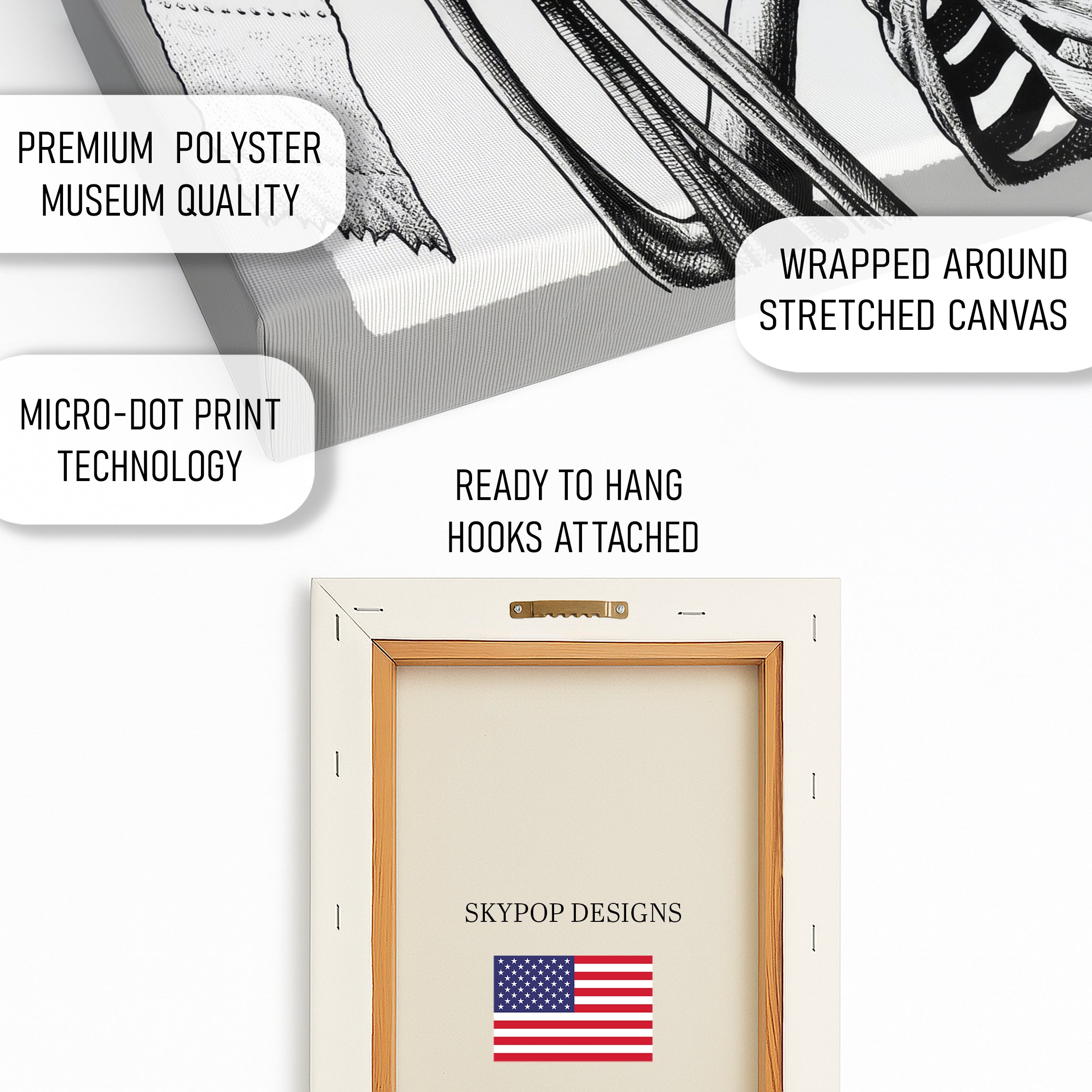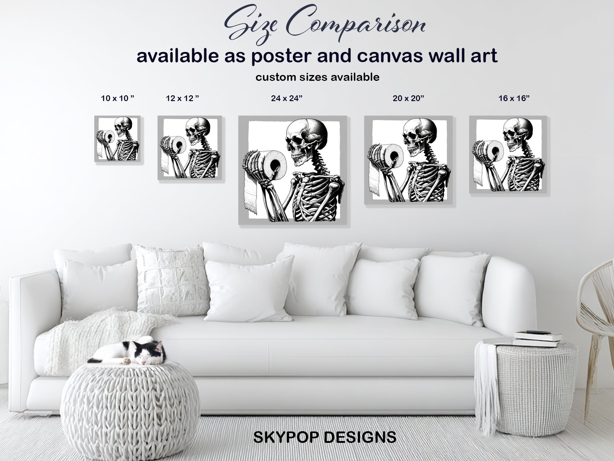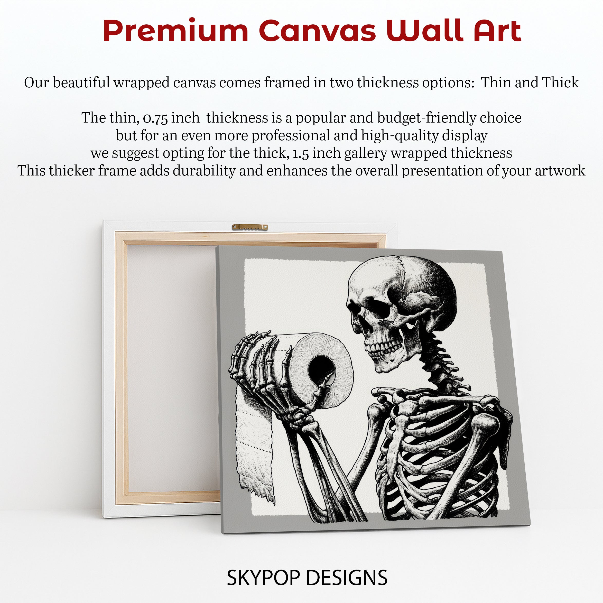 Add a touch of dark humor and modern flair to your space with this striking skeleton canvas wall art. This unique poster showcases a detailed illustration of a skeleton holding a roll of toilet paper, a conversation starter that is perfect for adding personality to any room. The black and white palette and stark linework make this an ideal fit for modern and minimalist decor styles, effortlessly enhancing contemporary living rooms, modern bathrooms, or even a home office. This captivating artwork, whether as a poster or canvas wall art, conveys a sense of playful morbidity and offers a refreshing departure from typical wall decor. It’s a bold statement piece that sparks dialogue and adds an unexpected twist to your interior design. Elevate your space with this unconventional yet artistic representation of a common item, bringing a unique vibe to dorm rooms or game rooms. The detailed stippling technique in this canvas wall art creates depth and visual interest, making it a standout piece. If youre looking for unique wall art or a distinctive poster for a gift, this skeleton art is an excellent choice for birthdays or housewarmings. Transform ordinary walls into a focal point with this memorable and creatively designed canvas wall art that celebrates individuality. Make a statement with this trending piece of artwork.