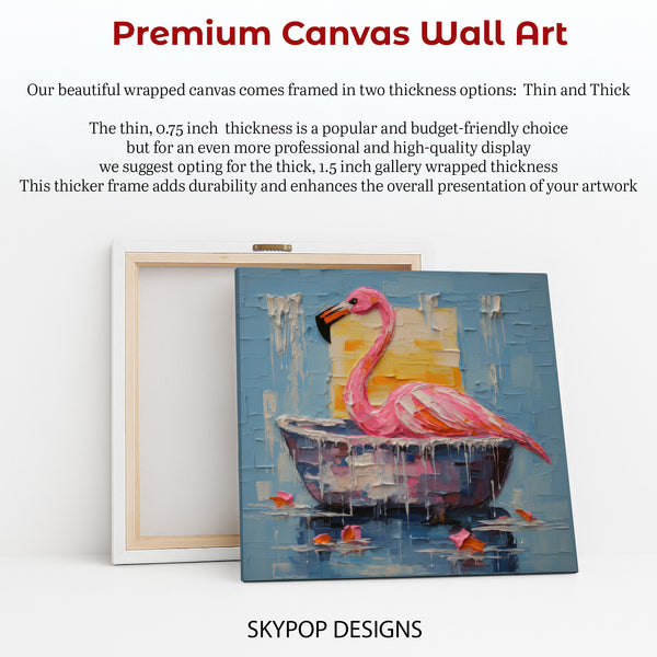 Bring a playful and vibrant touch to your home with this stunning flamingo canvas wall art. This unique poster showcases a charming flamingo enjoying a relaxing bath, rendered in a bold impasto style that adds incredible texture and depth. The striking pink of the flamingo pops against the cool blues and warm yellows, creating a captivating visual that's sure to be a conversation starter. This eye-catching canvas art is perfect for transforming your living room or adding a splash of personality to your bathroom decor. Ideal for those who love bohemian or contemporary styles, this piece also fits beautifully into modern settings. The vibrant colors evoke a sense of joy and tranquility, making it an inspiring addition to any space. Whether you're looking for modern living room wall decor or a unique bathroom poster, this artwork delivers. It's a fantastic gift idea for housewarmings, birthdays, or holidays, celebrated for its whimsical subject and artistic execution. The textured brushwork enhances the visual appeal, making this poster a true statement piece. Elevate your home atmosphere with this delightful flamingo artwork, celebrating a moment of whimsical relaxation. This high-quality canvas wall art transforms any room into a vibrant sanctuary. Embrace the unexpected with this captivating flamingo print today.