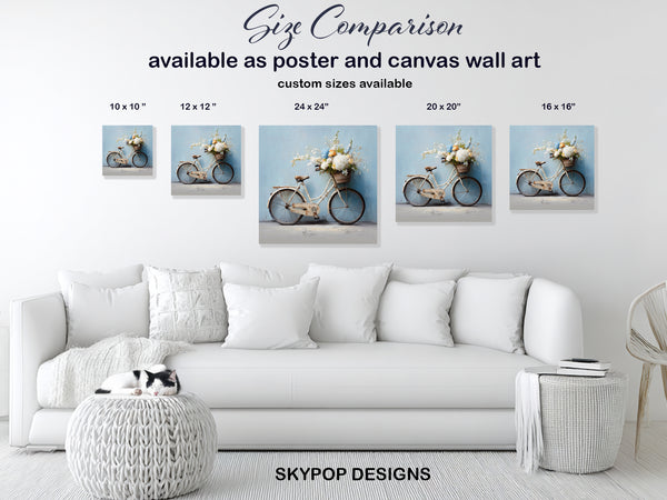 Vintage Bicycle Flower Basket Art, Poster or Canvas, Impressionism Whimsical Decor, Living Room Bedroom Art, Blue White Beige Multicolor