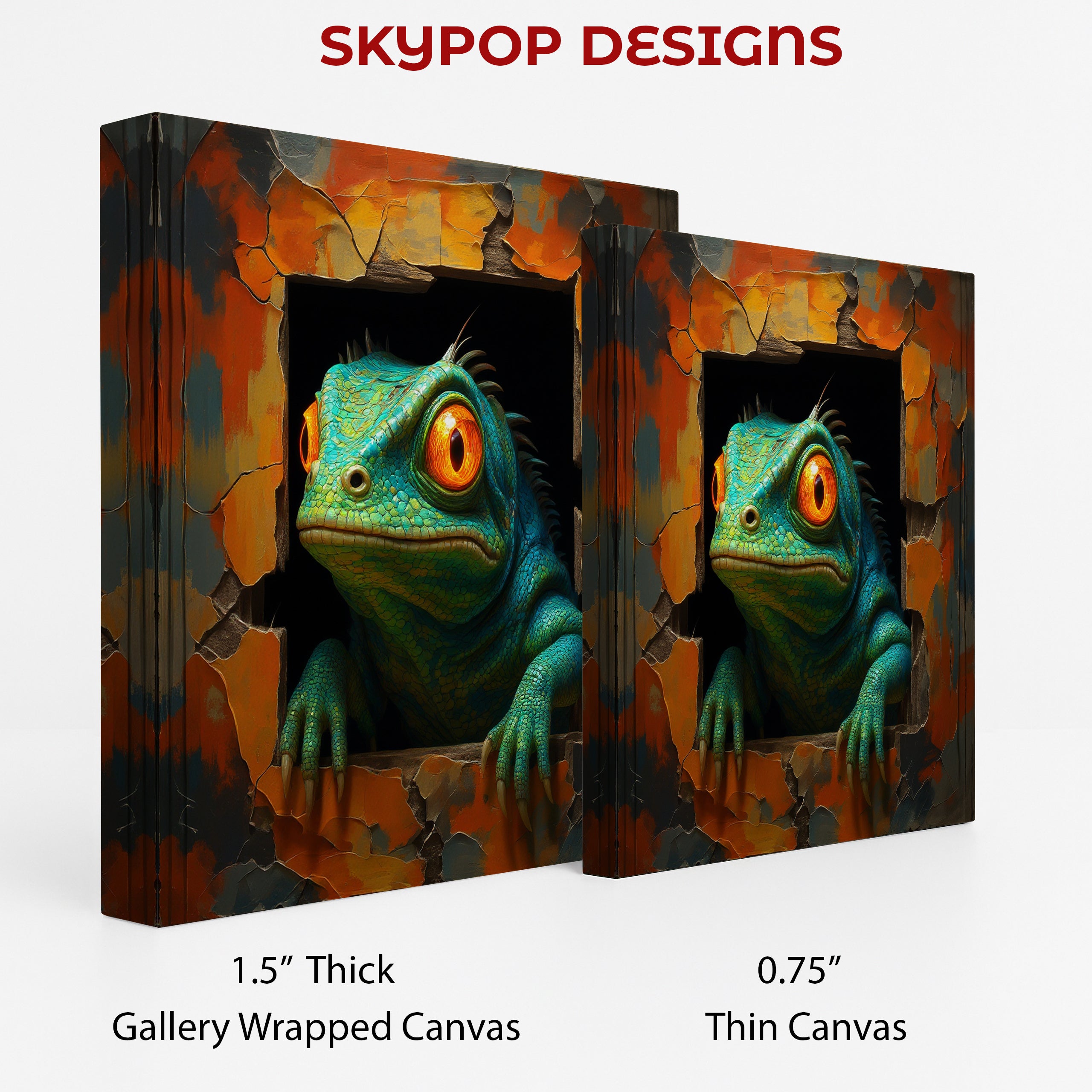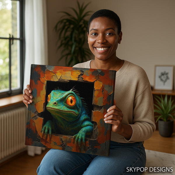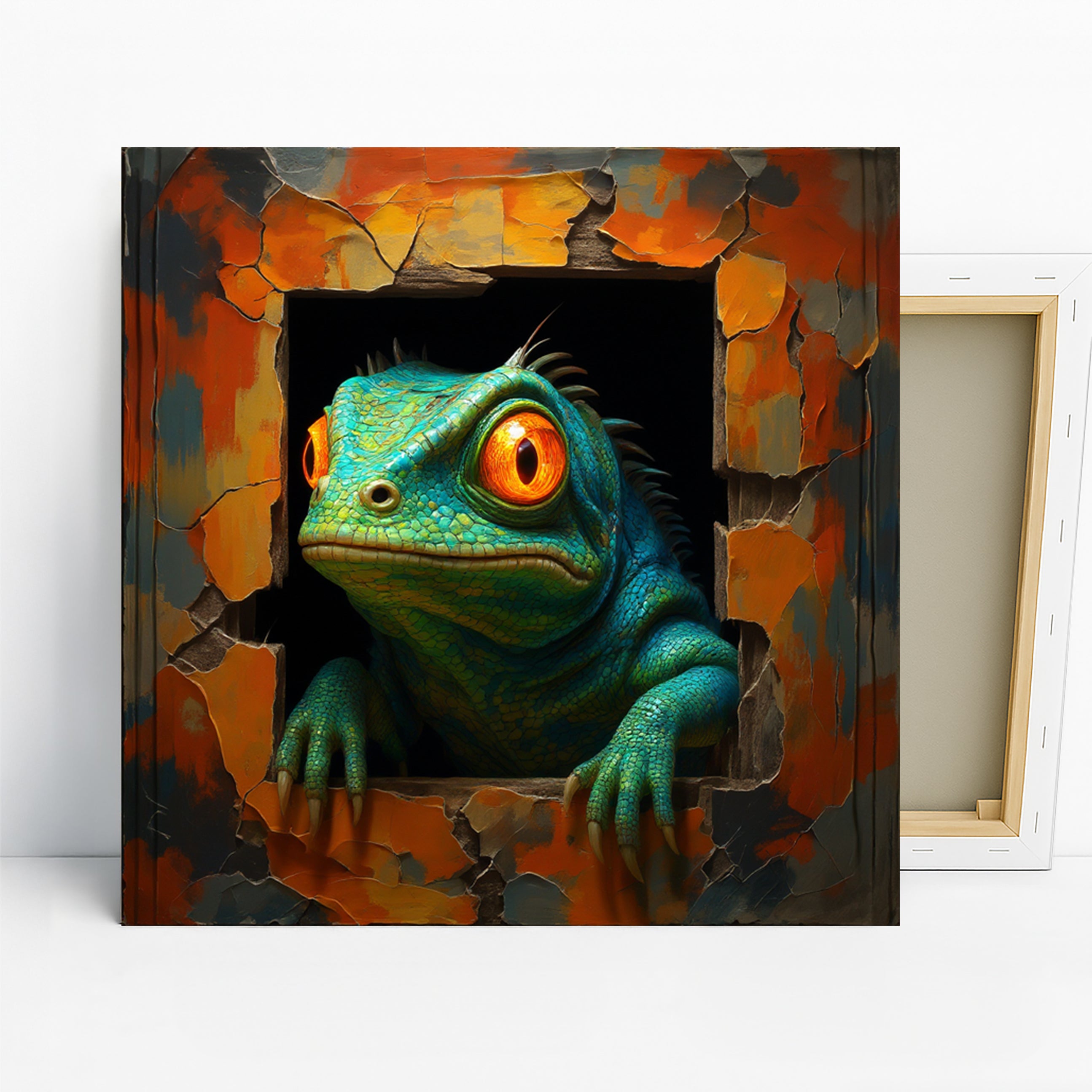 Transform your space with this striking lizard canvas wall art, featuring a vibrant gecko with captivating orange eyes peering out from a textured, broken frame. This unique poster showcases a blend of pop art and surrealism, creating a conversation starter for any room. The bold colors and intriguing subject matter make this canvas wall art a perfect addition to modern or eclectic decor styles. Enhance your living room, game room, or office with this high-quality print that adds a splash of personality and exotic charm. The detailed scales of the lizard and the dramatic cracked frame evoke a sense of mystery and wonder, making this artwork truly memorable. It's an ideal choice for those who love bold animal art and contemporary designs, bringing a visually stimulating element to your home. Whether as a housewarming gift or to refresh your personal space, this versatile canvas art is sure to impress. Available in various sizes, this poster captures the lizard's intense gaze and the artwork's dynamic composition beautifully. Elevate your everyday with this stunning piece that celebrates the beauty of nature with a modern, artistic twist. Inject a sense of playful intrigue and vibrant energy into your decor with this eye-catching gecko canvas wall art. Discover the perfect focal point for your wall art collection.