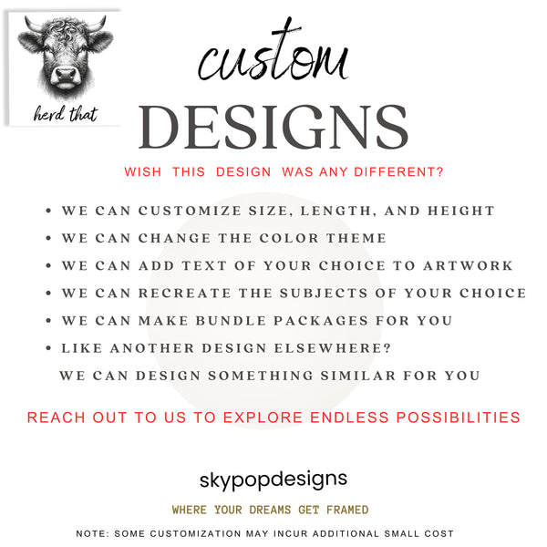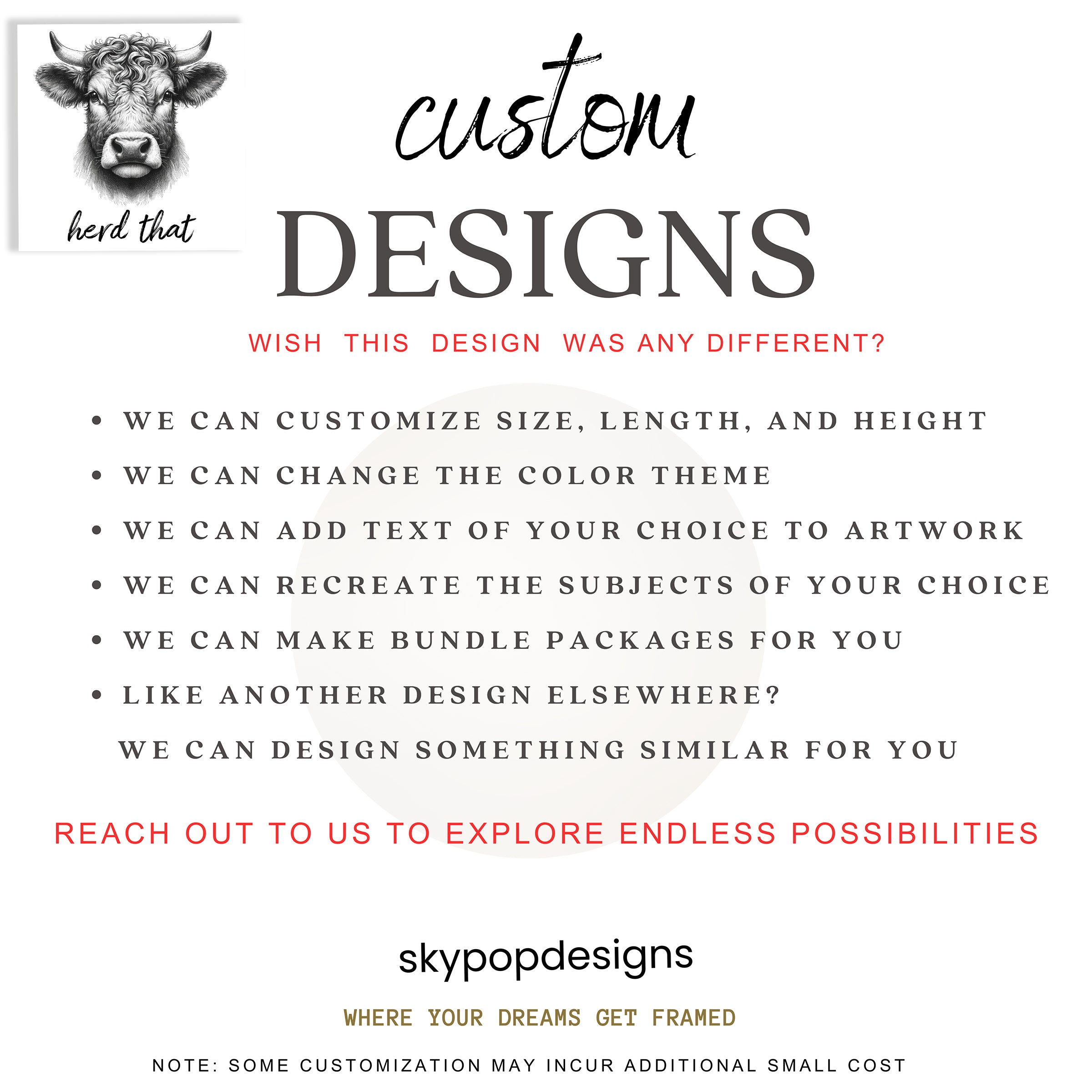 Looking for a custom design, or do you love a particular design but need it in a different size or orientation? Perhaps you've found a design elsewhere and wish for us to create something similar for you? Drop us a message! We're dedicated to meeting your needs and will work closely with you to ensure your vision comes to life.
