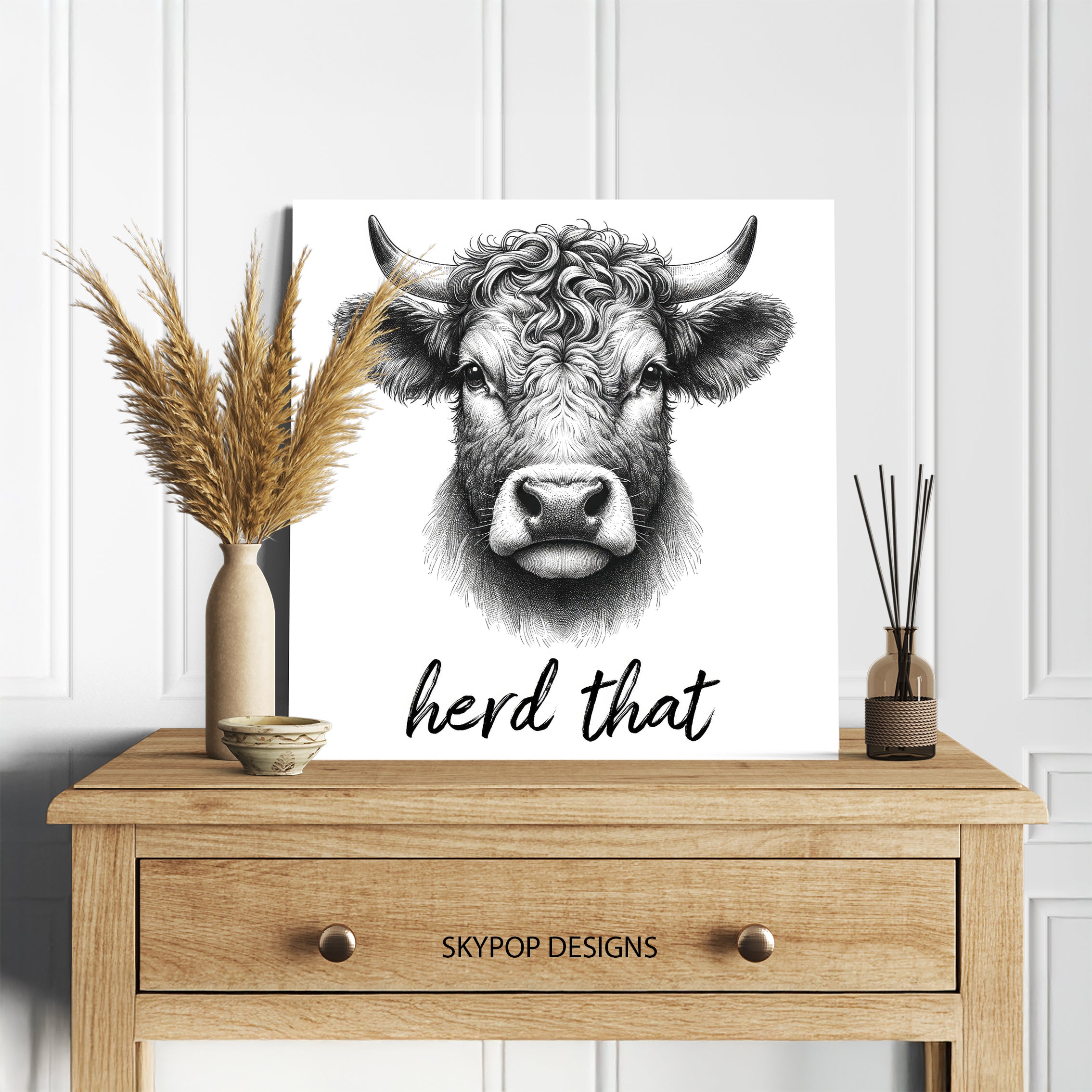 Highland Cow Art, Poster or Canvas, Vintage Farmhouse Decor, Living Room Kitchen Entryway Wall Art, Black White Grey, Herd That Boho Rustic