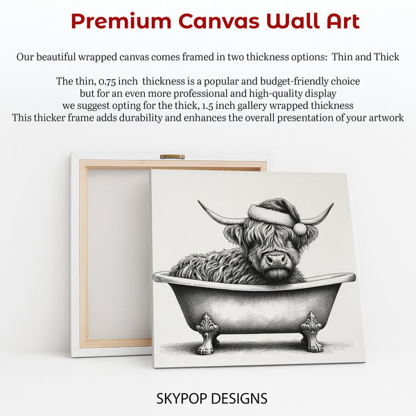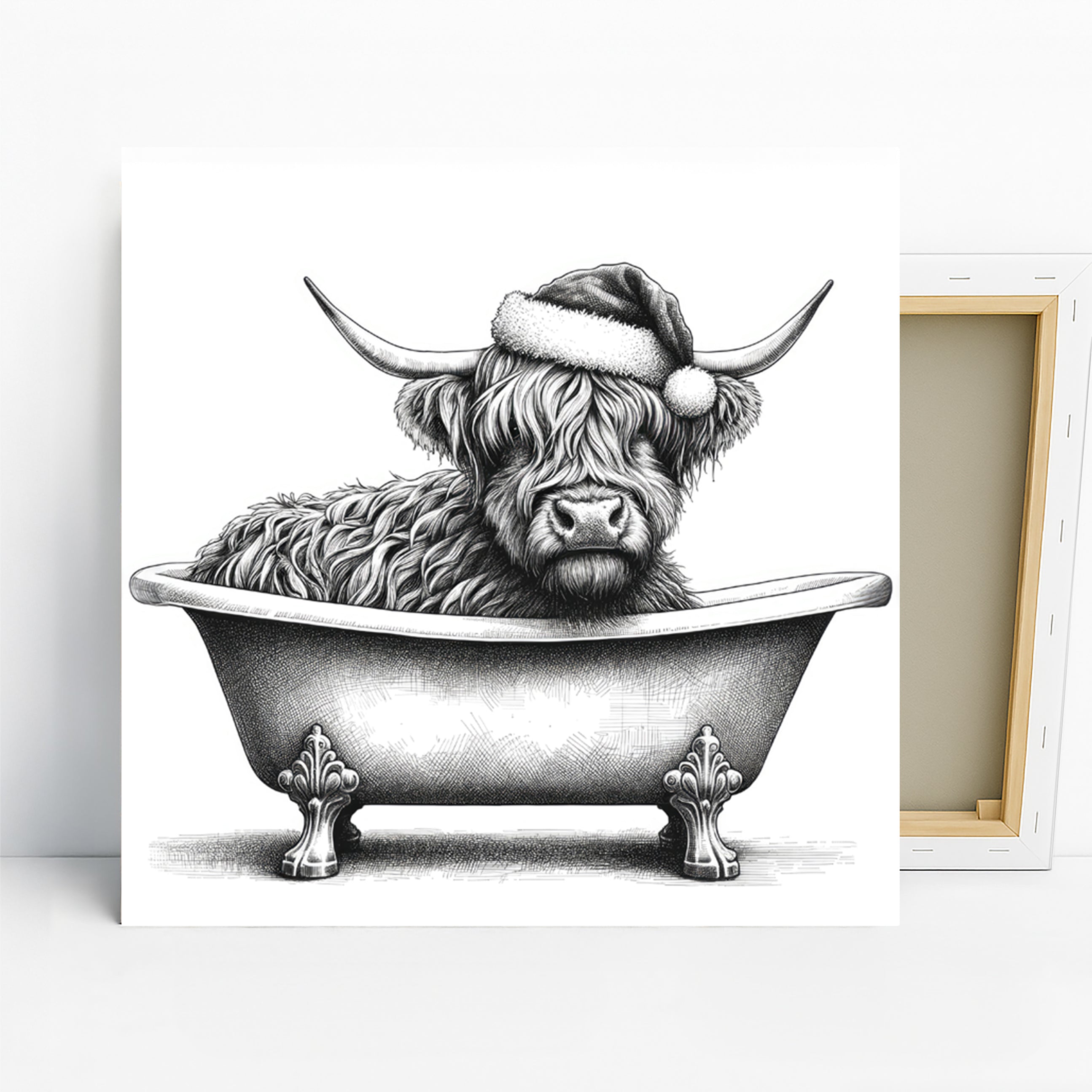 Keywords: Highland Cow Art, Canvas Wall Art, Whimsical Art, Vintage Art, Farmhouse Decor, Bohemian Decor, Rustic Decor, Bathroom Art, Nursery Art, Guest Room Decor, Entryway Art, Black and White Art, Grey Art, Cow Poster, Animal Art, Cozy Decor, Christmas Cow Art, Santa Hat Cow, Cute Cow Art, Home Decor, Wall Decor, Living Room Art, Children's Room Decor, Festive Art, Holiday Decor, Housewarming Gift, Gift for Animal Lovers, Unique Wall Art, Charming Art, Art Print