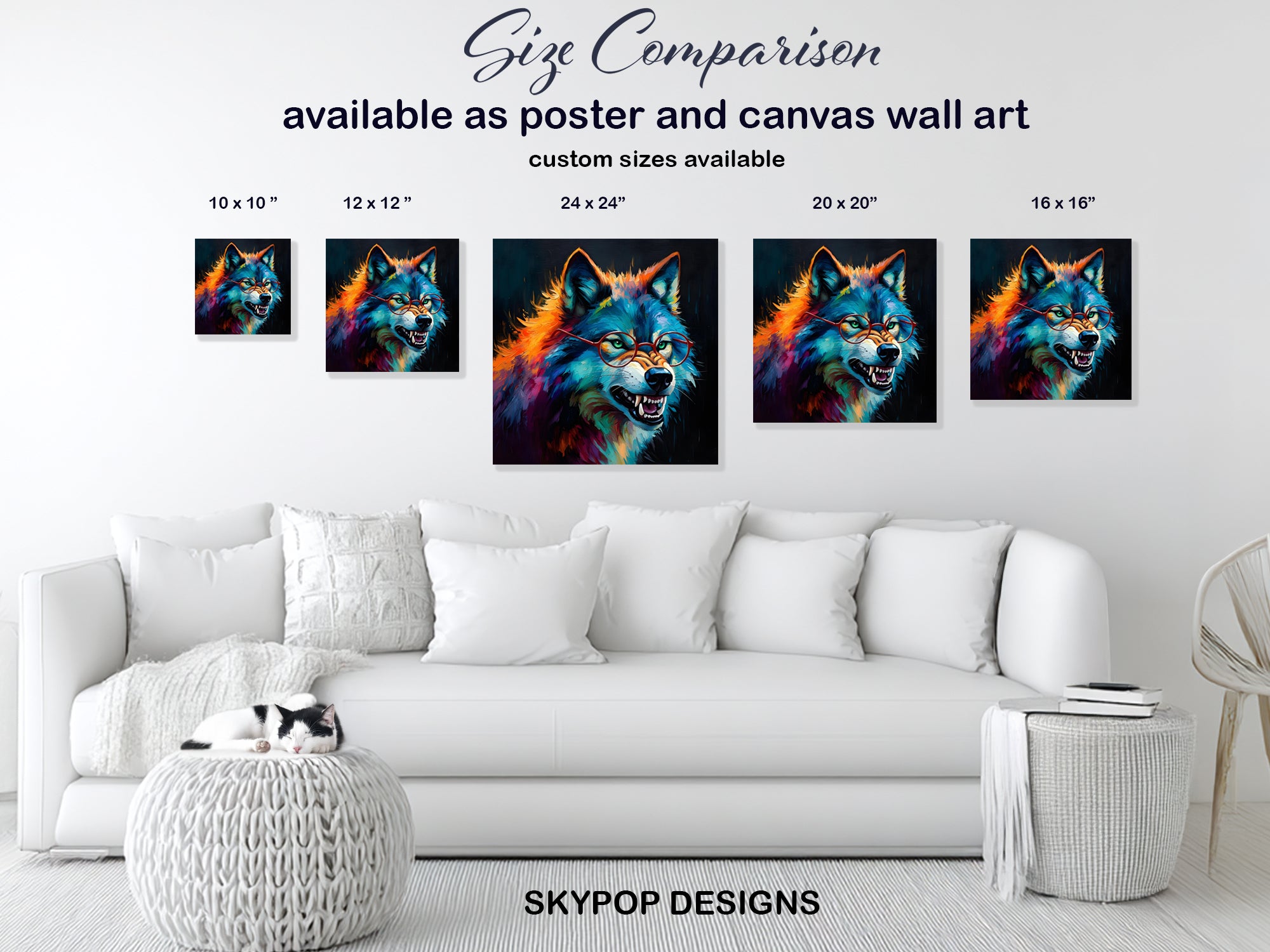 Transform your space instantly with this striking wolf canvas wall art that commands attention. This captivating piece showcases a wolf with vibrant, abstract brushstrokes and a pair of cool red glasses, adding a unique and intellectual flair to any setting. The bold use of blues and multicolor tones against a black background creates a powerful visual impact, making it ideal for modern living rooms or a sophisticated office space. This poster or canvas wall art is perfect for anyone who appreciates animal art with a contemporary twist, celebrating the wild spirit with a touch of studious charm, making it a fantastic conversation starter. The dynamic textures and energetic color palette inspire creativity and add a sense of depth and personality to your walls. Whether you're looking to enhance your eclectic decor or add a pop of color to a minimalist aesthetic, this artwork delivers. It's an excellent gift for students, academics, or anyone who admires wolves and unique wall decor. Elevate your home or workspace with this high-quality canvas print that captures attention and sparks imagination. This artwork is also a great choice for bar or game room decor seeking a distinctive touch. Showcase your bold style with this memorable wolf poster.