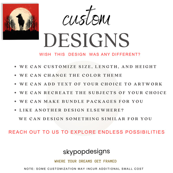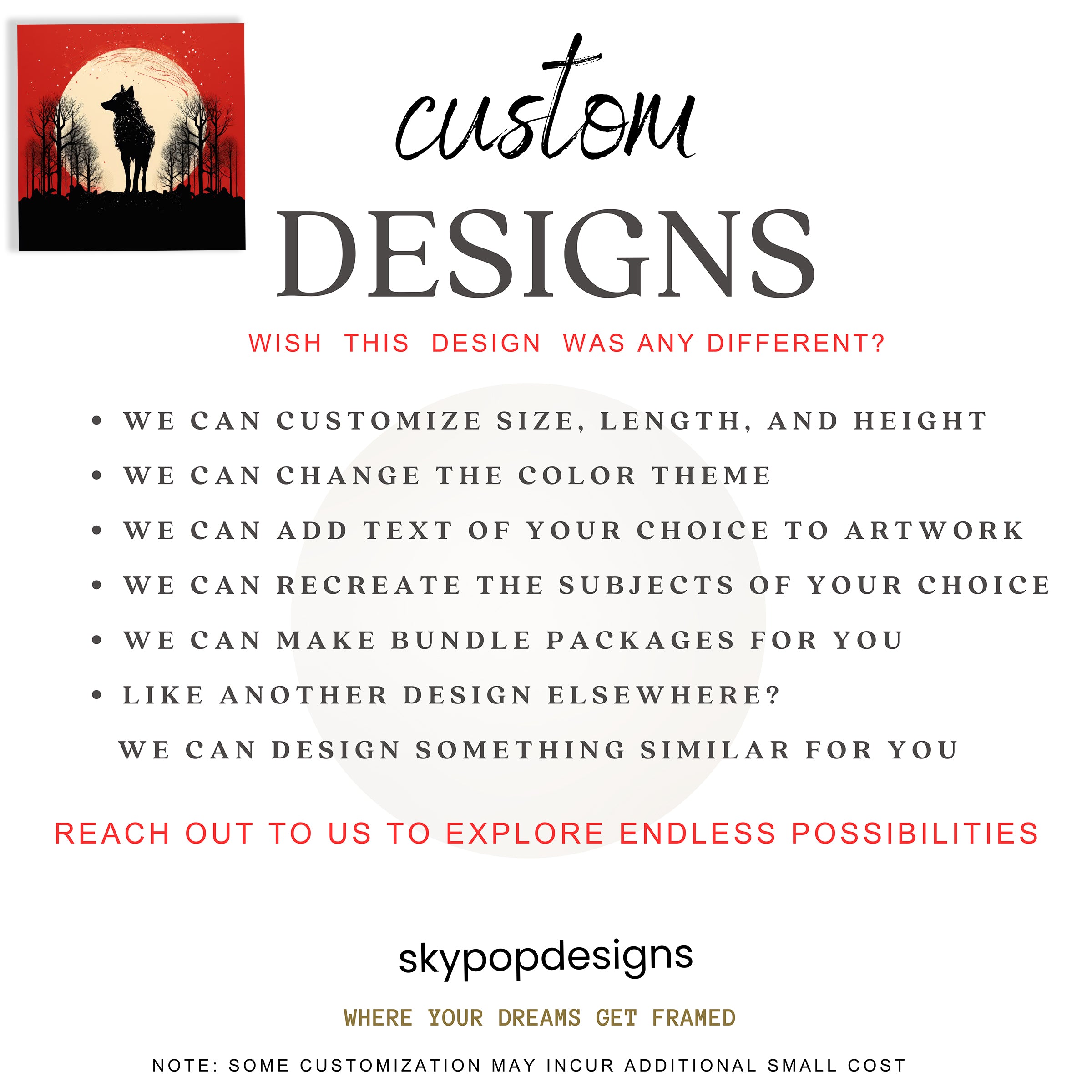 Looking for a custom design, or do you love a particular design but need it in a different size or orientation? Perhaps you've found a design elsewhere and wish for us to create something similar for you? Drop us a message! We're dedicated to meeting your needs and will work closely with you to ensure your vision comes to life.
