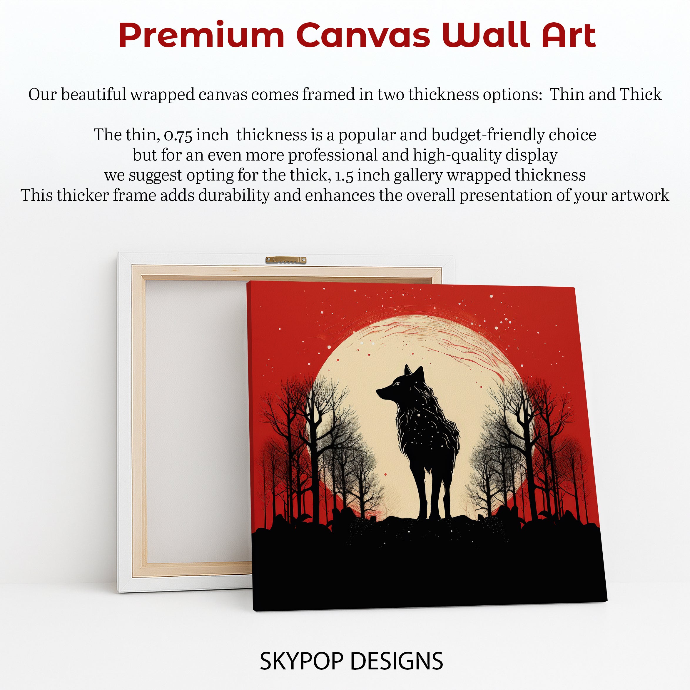 Transform your space with this striking wolf canvas wall art, featuring a lone wolf silhouetted against a vibrant red sky and a large moon. This captivating poster or canvas wall art piece blends nature art with a bold, contemporary aesthetic that will surely elevate any room. The stark contrast between the black wolf, the luminous moon, and the dramatic red background creates a powerful and memorable visual statement. Perfect for modern living rooms or moody bedrooms, this artwork adds a touch of wild elegance and a sense of untamed spirit to your decor. This stunning canvas wall art is ideal for those who appreciate the raw beauty of nature and the mystique of wolves, making it a fantastic gift for nature lovers or any occasion. Its minimalist yet impactful design makes it a versatile addition that complements both Scandinavian and contemporary decor styles. The rich red color evokes passion and energy, while the black and white elements provide a classic, sophisticated feel. This high-quality canvas wall art prints are available in various sizes, ensuring a perfect fit for your wall. Showcase your connection to the wild with this breathtaking wolf poster. Elevate your home's atmosphere and bring the call of the wild indoors. Make this captivating wolf artwork the centerpiece of your wall art collection today. This artwork also works beautifully as a modern entryway decor for a dramatic first impression.