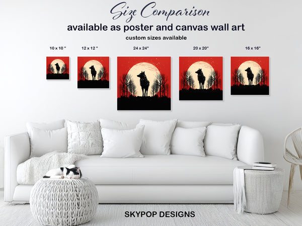 Wolf Moon Art, Canvas or Poster, Nature Scandinavian Decor, Living Room Bedroom Office Wall Art, Red Black Yellow White, Modern Animal Art