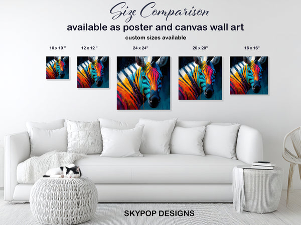 Zebra Splash Art, Canvas or Poster, Pop Art Bohemian Decor, Living Room Bedroom Office Wall Art, Multicolor Blue Orange Pink