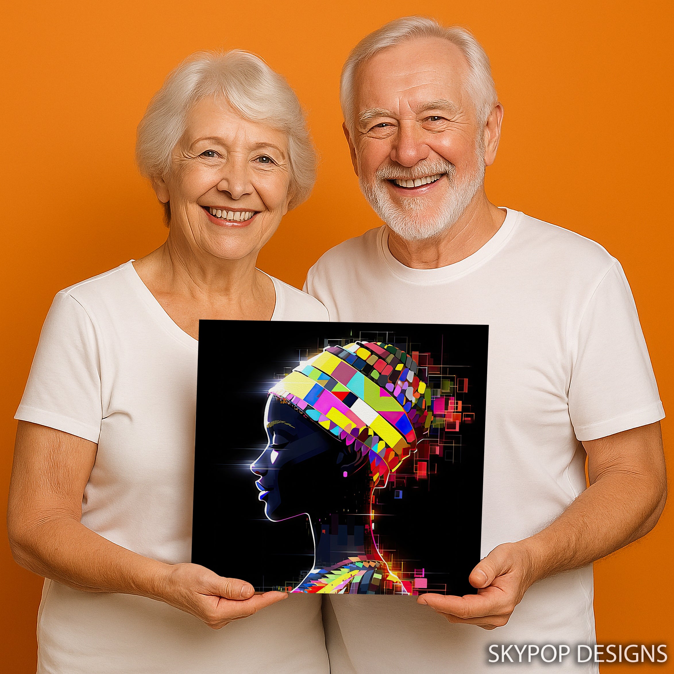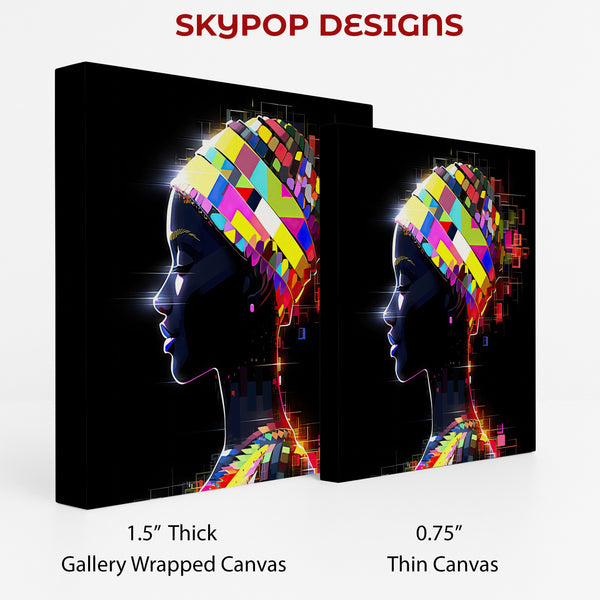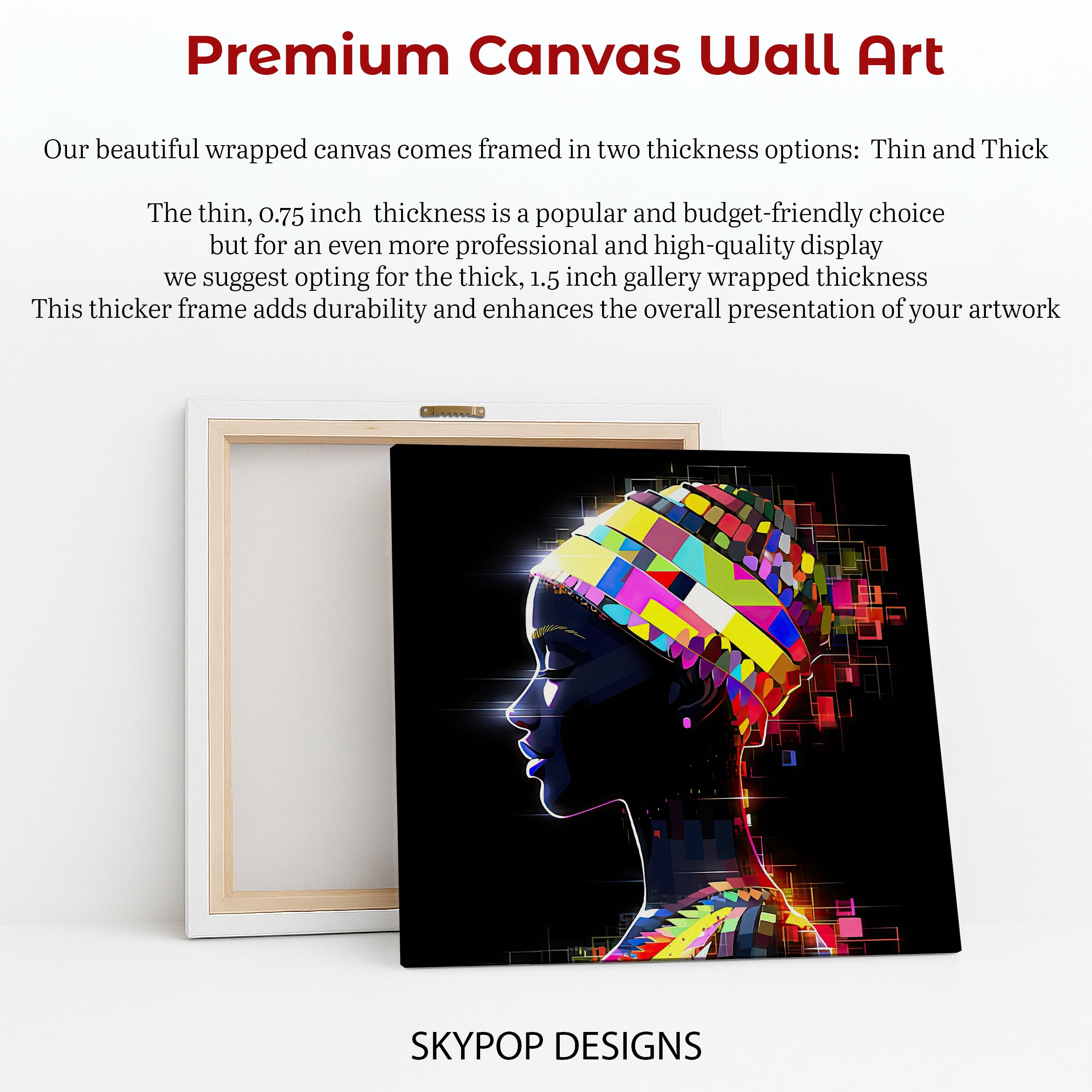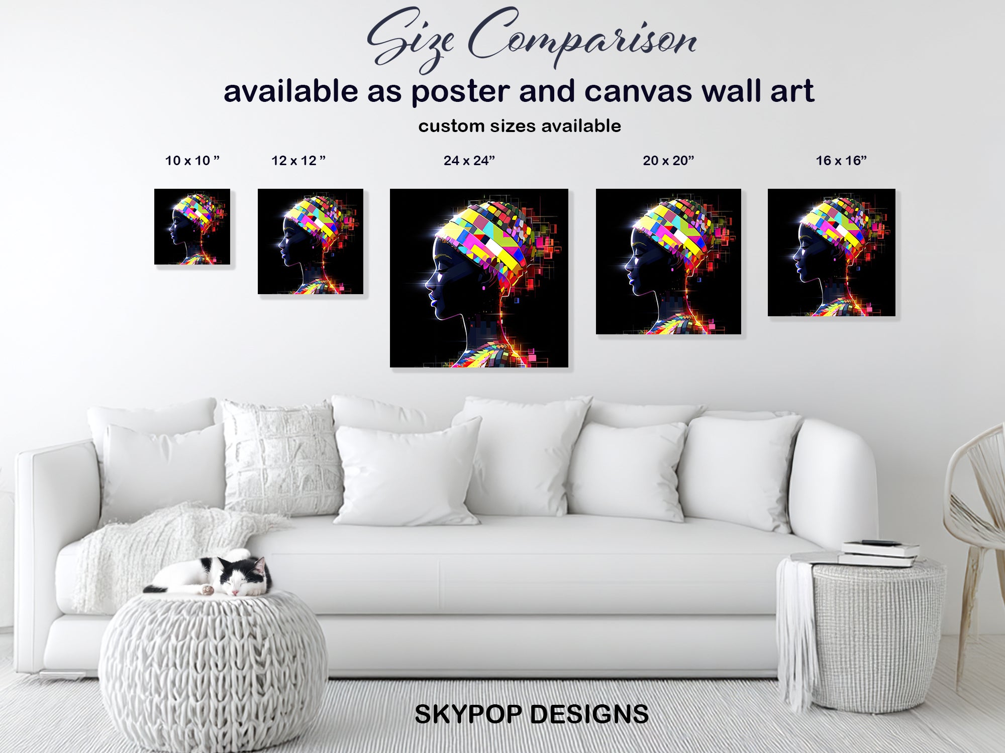 Keywords: African American Art, Contemporary Art, Pop Art, Modern Decor, Glam Decor, Bohemian Decor, Living Room Art, Bedroom Art, Entryway Art, Office Decor, Multicolor Art, Yellow Art, Purple Art, Vibrant Canvas Art, Profile Wall Art, Woman's Profile Art, Headwrap Art, Bold Art, Graphic Art, Home Decor, Wall Art, Canvas Print, Statement Piece, Conversation Starter, Housewarming Gift, Birthday Gift, Abstract Art, Geometric Art, Artistic Expression, Unique Wall Art
