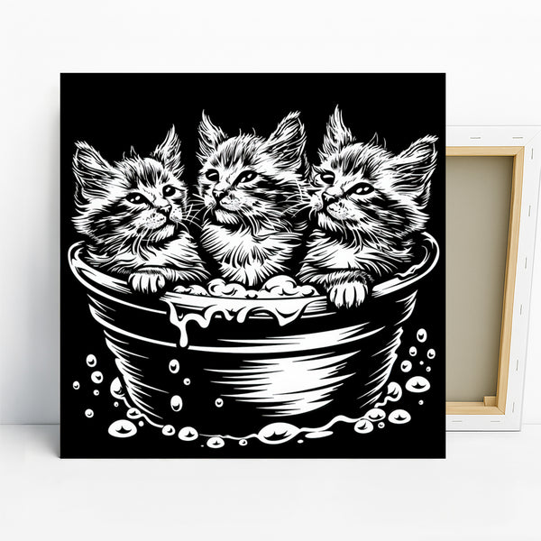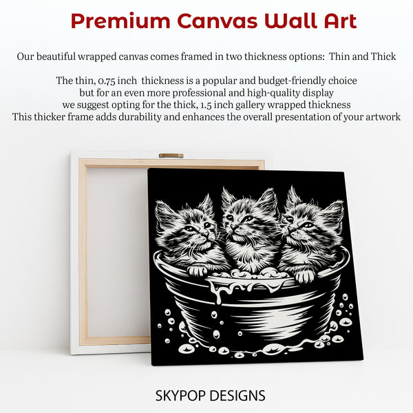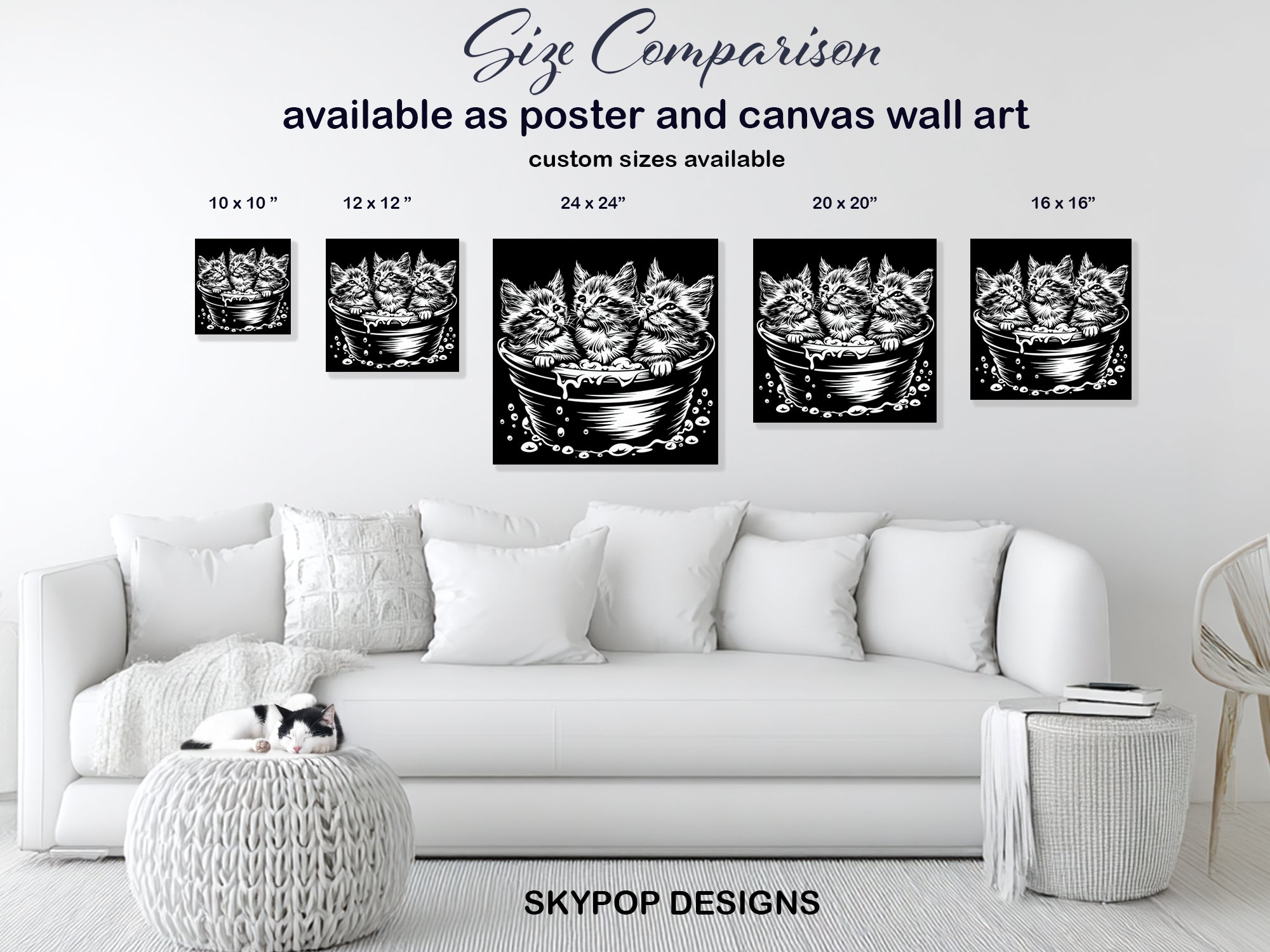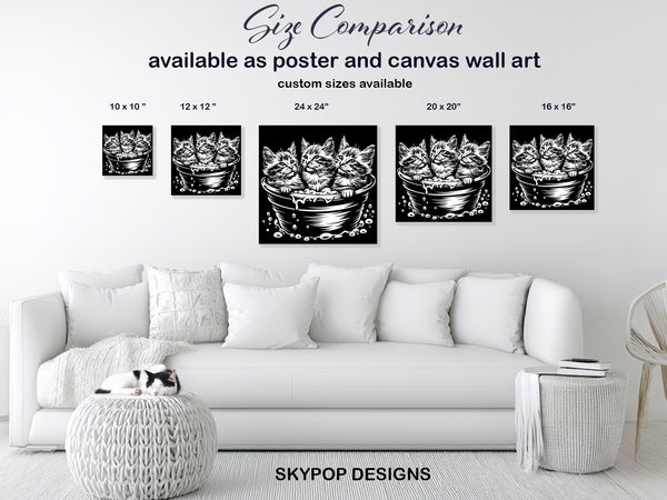Bathtime Kitties Art, Canvas or Poster, Whimsical Animal Decor, Living Room Bedroom Bathroom Children Room Wall Art, Black White Multicolor