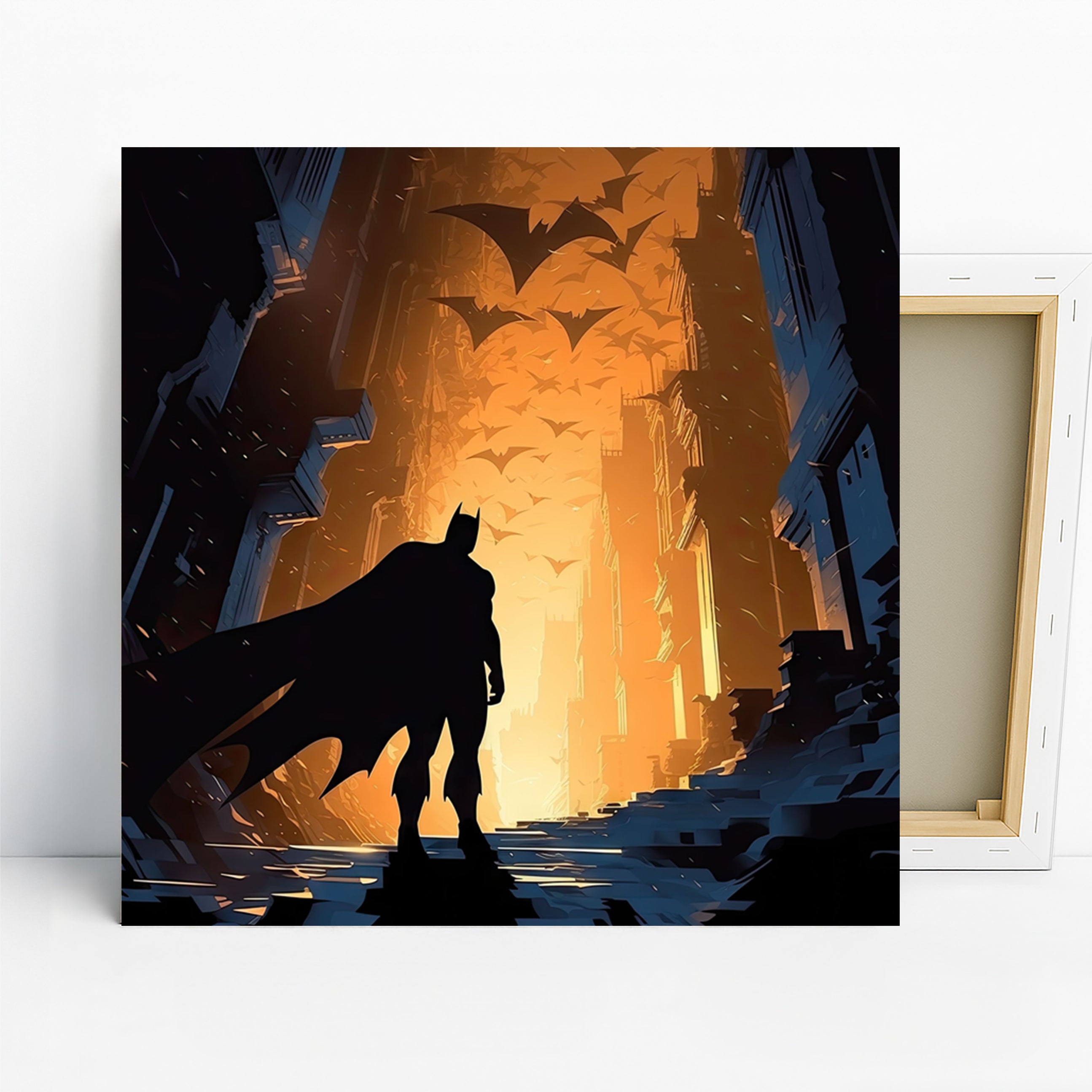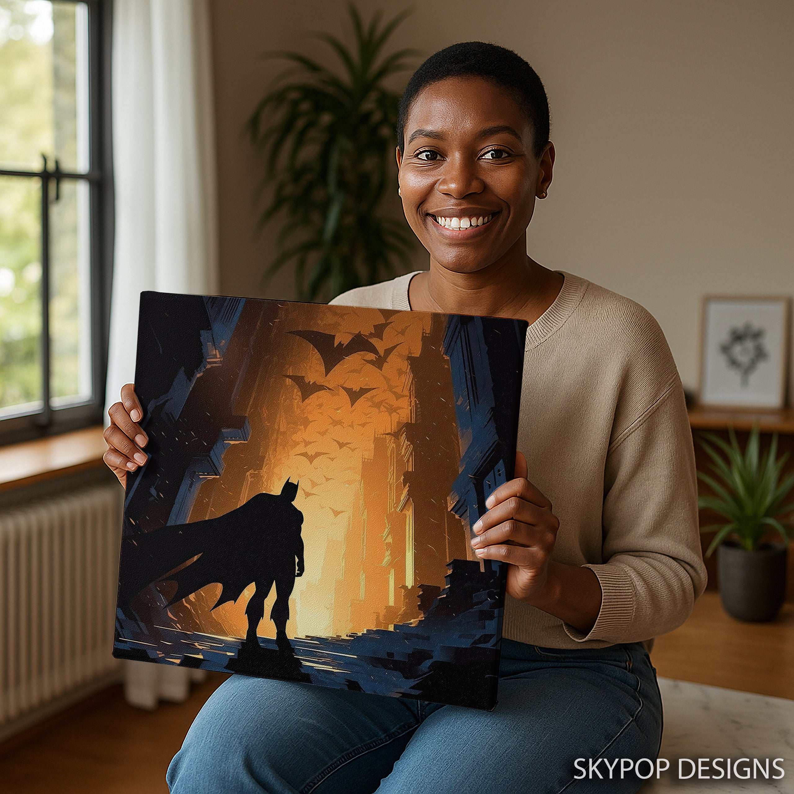 Transform your space with this striking Batman canvas wall art inspired by street art and comic book heroism. This captivating poster captures the iconic silhouette of Batman standing against a backdrop of a stylized city, illuminated by a warm, orange glow and a swarm of bats. The bold use of black, orange, and blue colors creates a dramatic and energetic visual that's perfect for modern living rooms, offices, or game rooms. Elevate your decor with this unique piece of contemporary art that showcases the mystery and power of the Dark Knight. This canvas wall art is ideal for fans of superhero culture and adds a touch of urban sophistication to any home. The striking imagery and vibrant colors make this poster a conversation starter and a focal point in any setting. Enhance your walls with this visually dynamic artwork, a perfect gift for birthdays, holidays, or housewarmings. Celebrate your favorite hero with this high-quality canvas print that brings cinematic action into your living space. Invest in this statement piece to add a bold splash of color and character to your wall decor. Transform your room into a haven for comic book enthusiasts with this unforgettable Batman wall art. Add this powerful Batman poster to your collection and let it inspire your everyday endeavors.