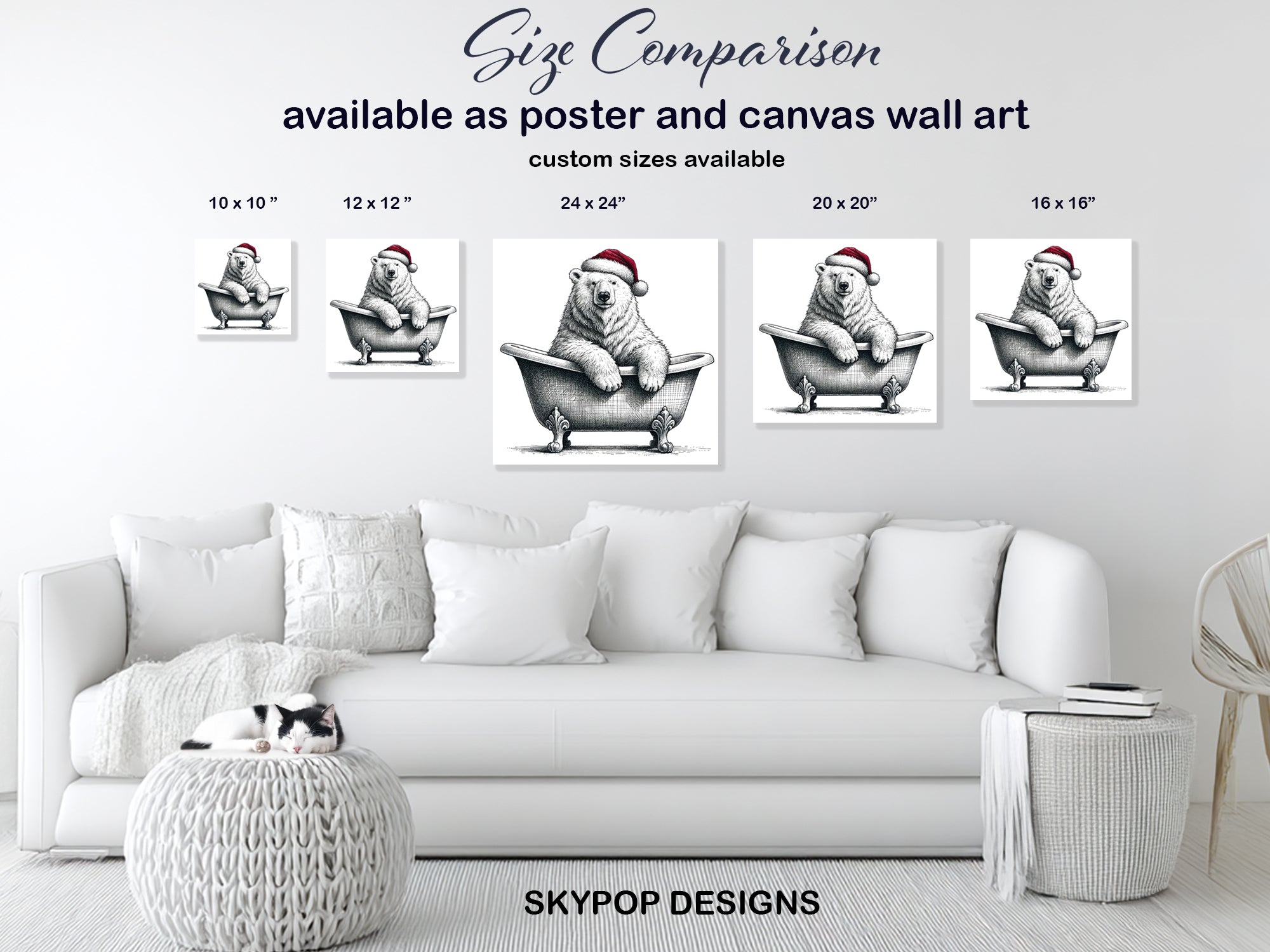 Brighten your home with this fun polar bear canvas wall art featuring a festive bear taking a relaxing bath. This playful poster captures the charm of a polar bear wearing a Santa hat, creating a delightful and whimsical addition to any space. The striking black and white artwork with a pop of red from the hat brings a touch of holiday spirit and cozy comfort. Perfect for your bathroom decor, living room, or a children's bedroom, this canvas print adds personality and warmth. The detailed linework and classic aesthetic make this wall art a unique piece that can complement various decor styles from modern to farmhouse. Ideal for gifting during the holiday season or as a housewarming present, this artwork is sure to bring smiles. It's a fantastic way to transform your space and create a cheerful atmosphere. Available in multiple sizes, this high-quality print on canvas ensures lasting beauty. Elevate your wall decor with this captivating and merry bear artwork. Bring a touch of playful holiday cheer to your home today with this charming polar bear canvas art.