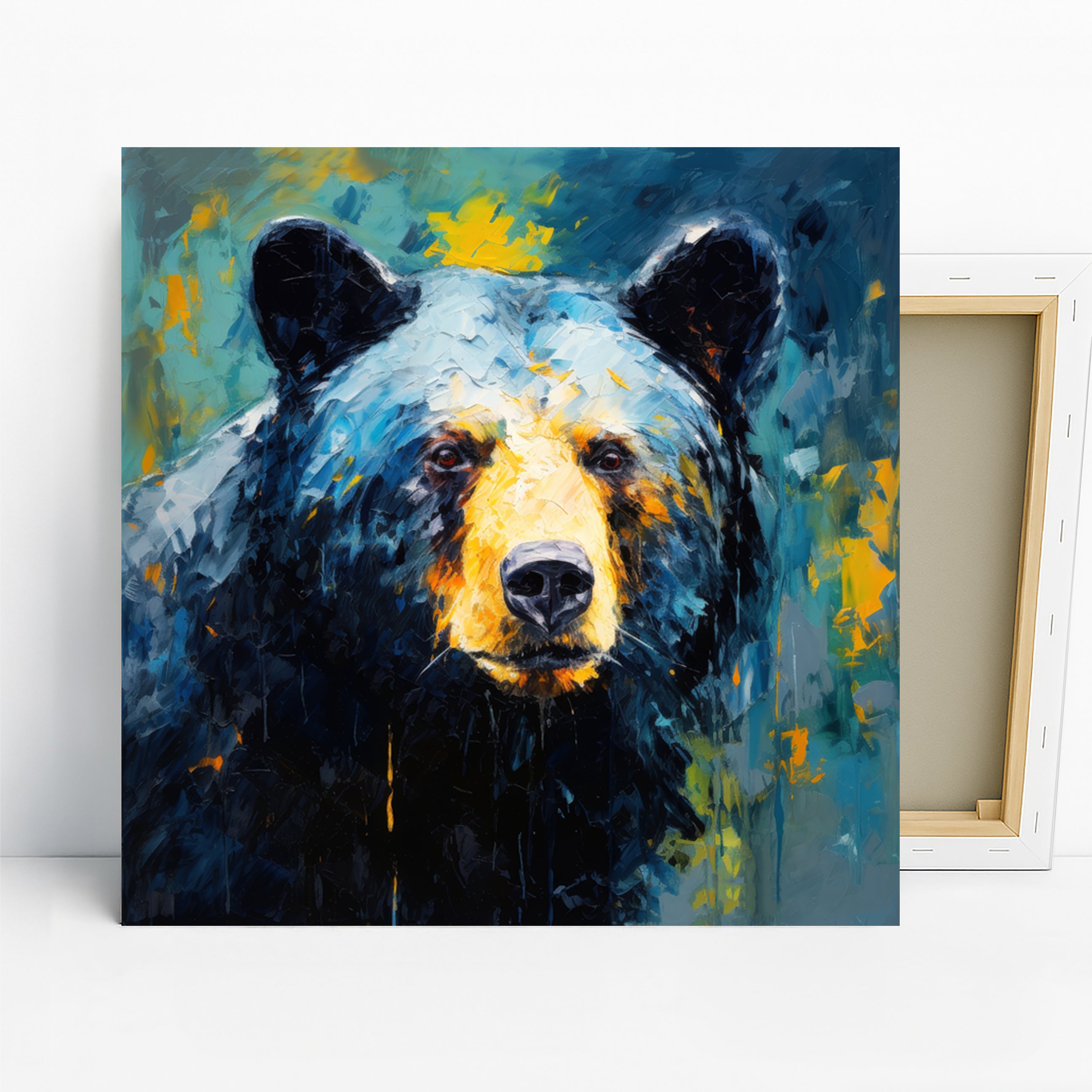 Keywords: Abstract Bear Art, Animal Wall Art, Contemporary Canvas, Modern Home Decor, Rustic Chic, Bohemian Wall Art, Living Room Art, Bedroom Decor, Entryway Art, Office Wall Decor, Blue Yellow Art, Multicolor Canvas, Bold Bear Portrait, Abstract Animal, Wildlife Wall Art, Bear Painting, Textured Brushstrokes, Expressive Art, Nature Lover Gift, Housewarming Gift, Birthday Gift, Unique Wall Art, Artistic Flair, Dramatic Color, Wildlife Spirit, Home Transformation Art, Statement Wall Art, Impactful Art Print, High Quality Canvas, Artistic Bear