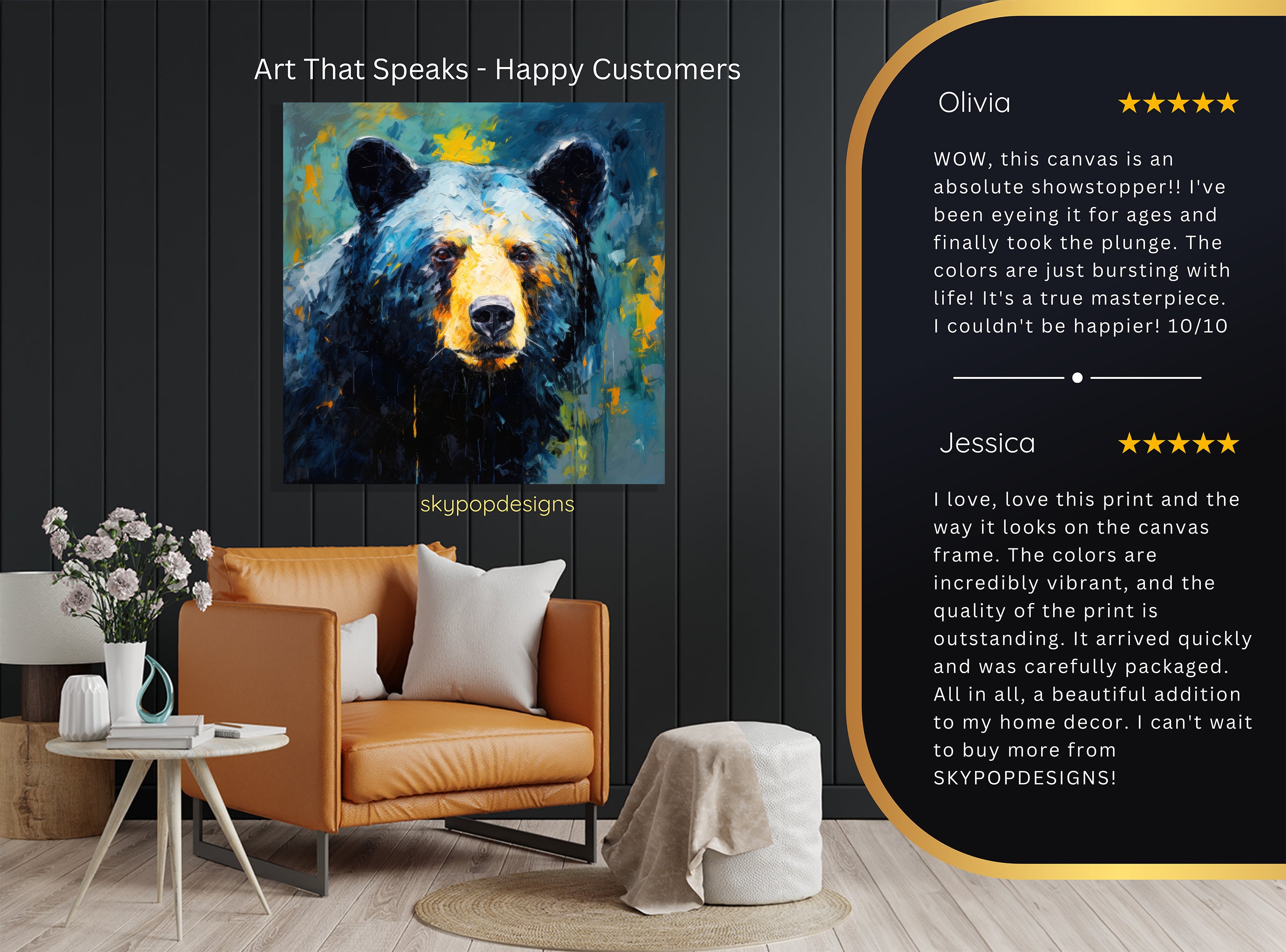 At SKYPOPDESIGNS, we specialize in high-quality canvas and poster prints designed to bring sophistication and style to your space. Please note that our designs are not created with 3D textures or as original oil, acrylic, or watercolor paintings; they are instead HD reproductions of original artwork. This approach allows us to offer these visually stunning pieces at competitive prices, ensuring you receive top-tier, maintenance-free art that's easy to enjoy.