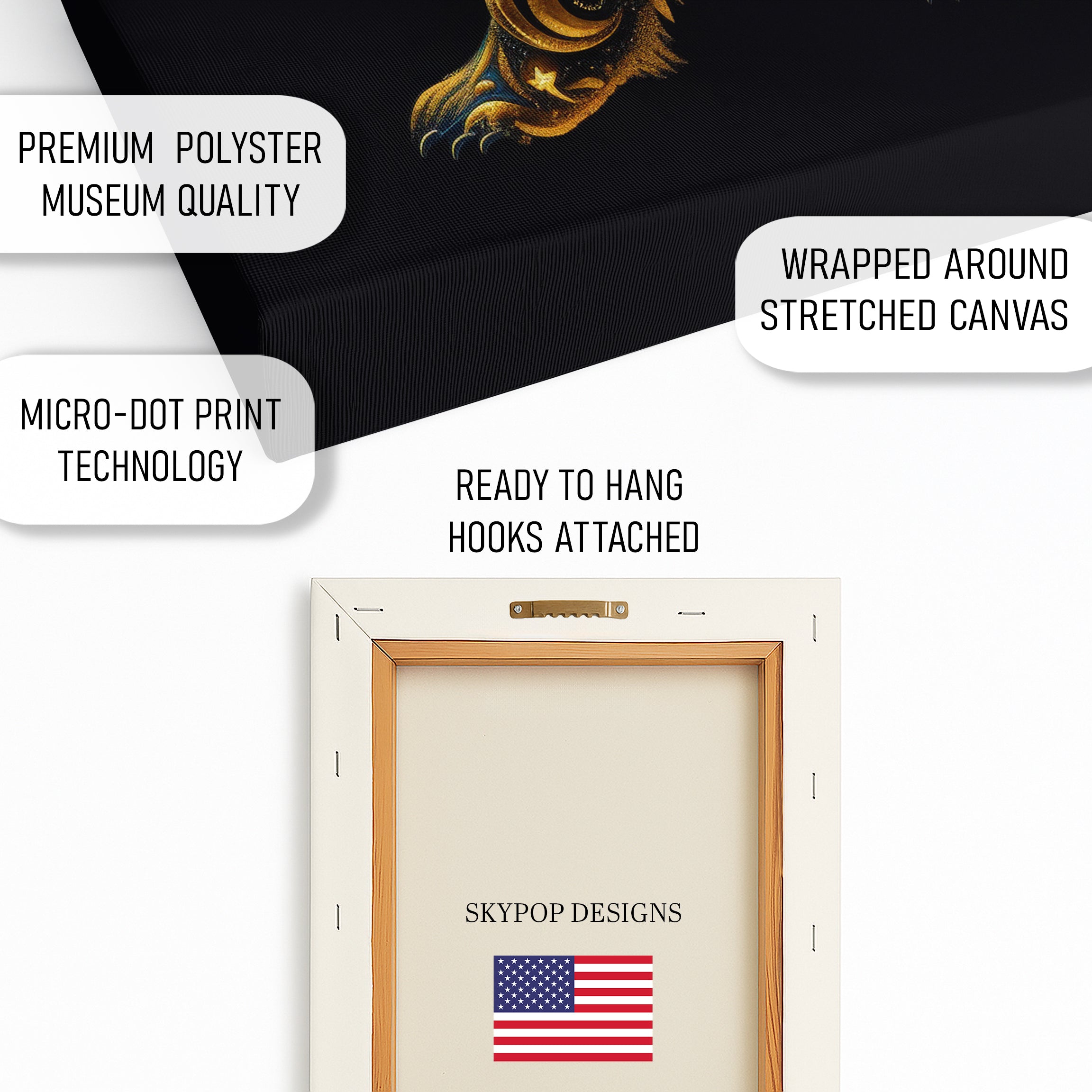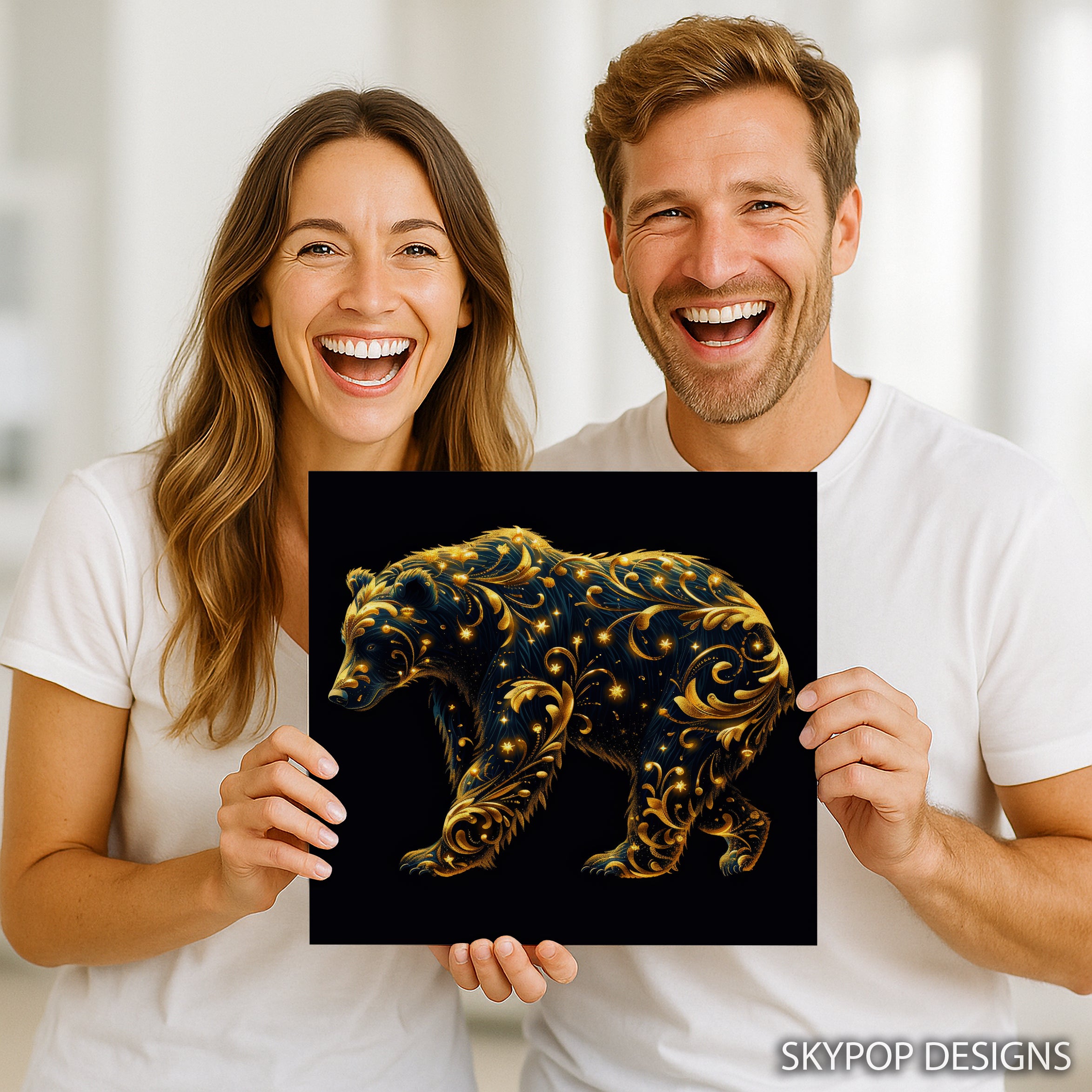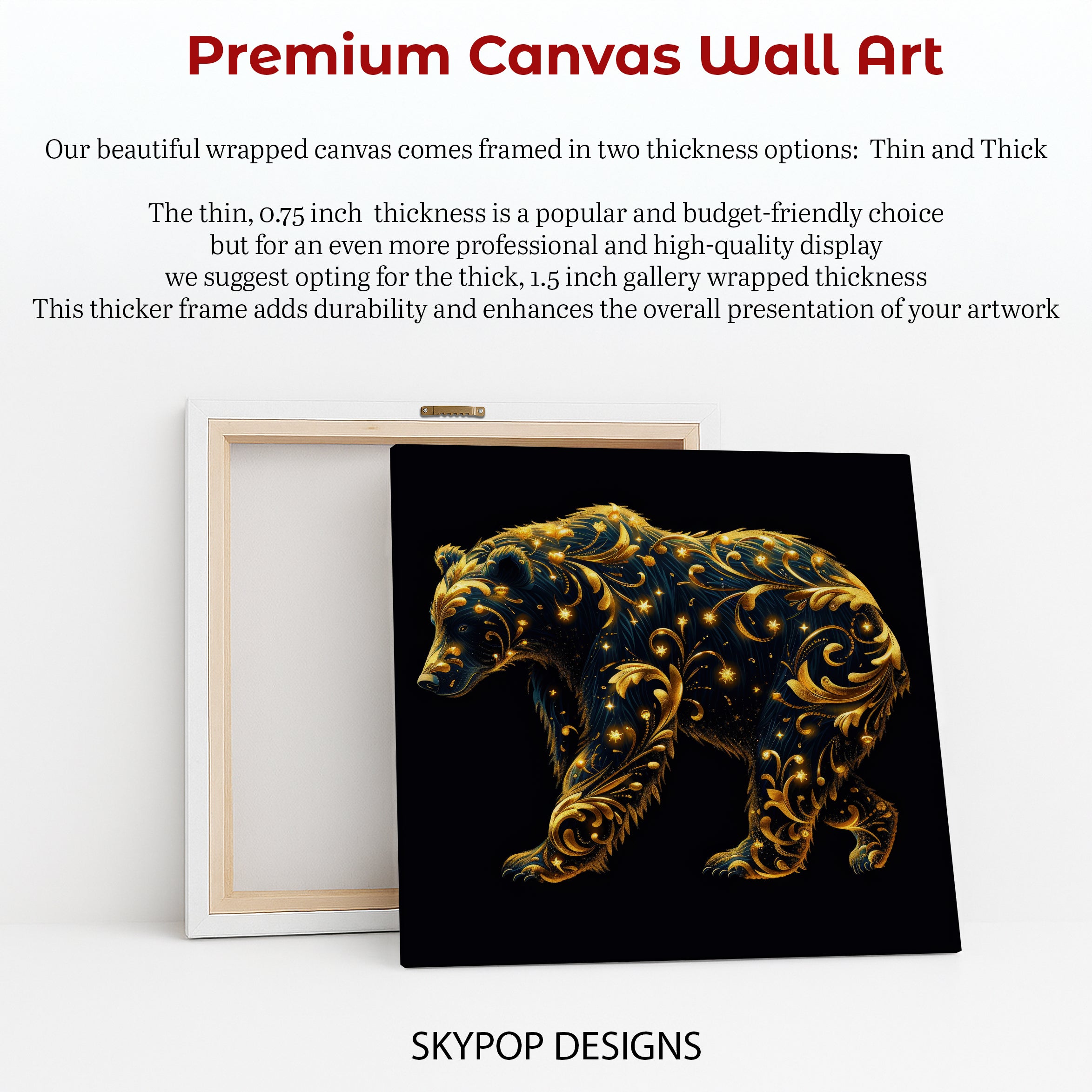 Elevate your space with this striking bear canvas wall art, featuring a magnificent bear adorned with intricate gold filigree and shimmering stars against a deep, dark backdrop. This captivating artwork transforms any room into a statement of wild elegance and cosmic wonder. The bold colors and abstract elements within this poster or canvas wall art create a luxurious feel, perfect for modern living rooms or glamorous bedrooms. Its unique design makes it a perfect focal point for entryways, welcoming guests with its awe-inspiring presence. This piece also makes an ideal gift for those who appreciate nature-inspired art and bold decor. The interplay of gold and black evokes a sense of opulence and mystery, enhancing the mood of sophistication. Ideal for bohemian decor enthusiasts seeking a touch of celestial magic, this canvas art brings a unique energy to contemporary spaces. The dynamic brushwork and starry accents add texture and depth, ensuring this striking wall art is a conversation starter. Whether you're looking to add a touch of luxury to your office or a touch of wonder to your home, this bear poster is a versatile choice. Celebrate the power and beauty of nature with this stunning piece of abstract animal art. Enhance your home decor with this high-quality canvas print that promises both visual impact and lasting appeal. Discover the magic and allure of the wild with this unforgettable bear artwork today.