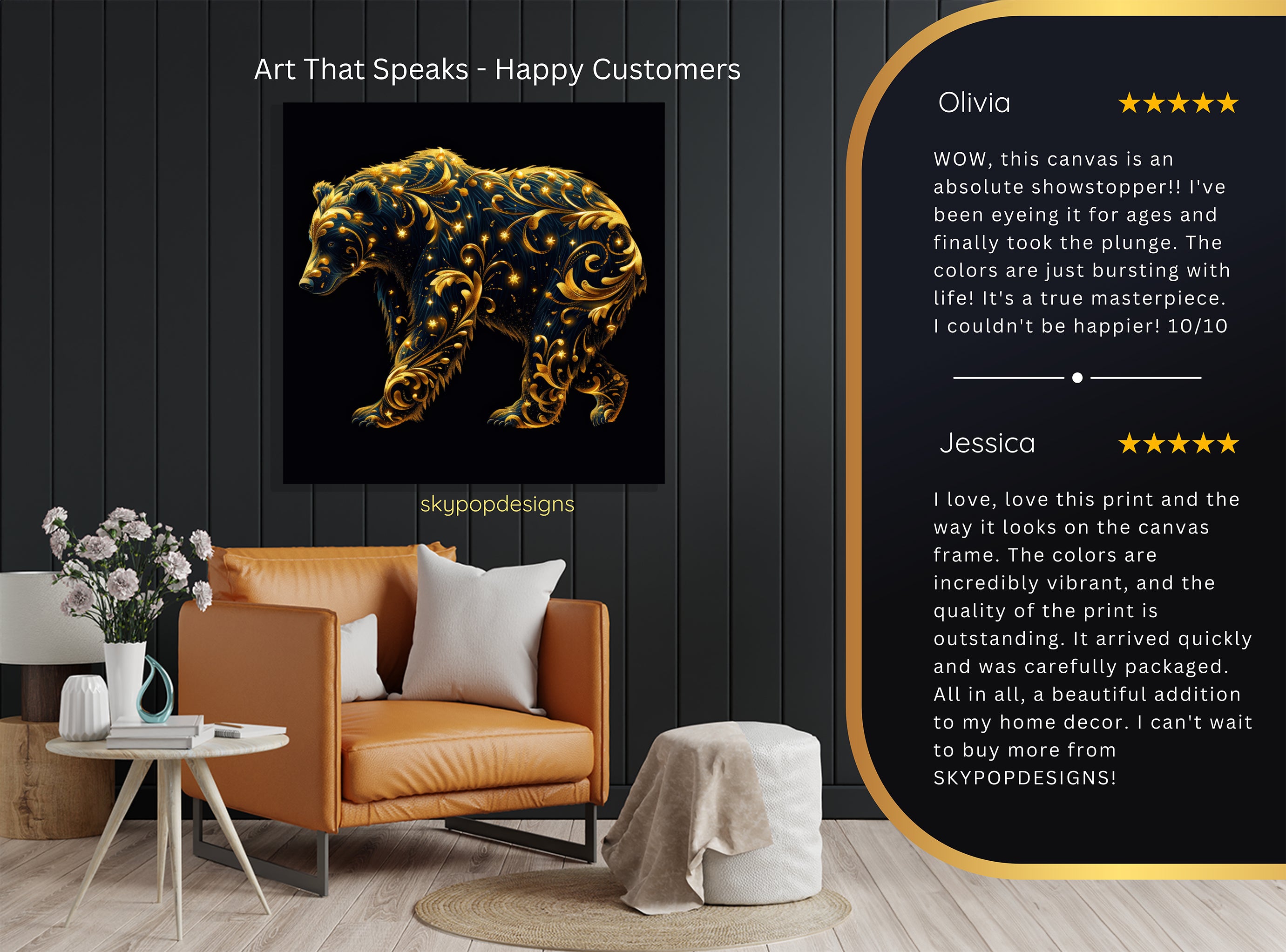 Keywords: Golden Bear Wall Art, Bear Canvas Print, Abstract Bear Art, Nature Art Prints, Graffiti Wall Art, Modern Decor, Glam Decor, Bohemian Decor, Living Room Art, Bedroom Wall Art, Entryway Decor, Office Wall Decor, Gold Black Art, Multicolor Wall Art, Bear Artwork, Spirit Animal Art, Wild Elegance, Cosmic Wonder Art, Luxury Wall Art, Statement Piece, Celestial Magic Decor, Nature Inspired Art, Bold Decor Accents, Opulent Art Gifts, Sophisticated Home Decor, Contemporary Space Art, Dynamic Brushwork Art, Animal Wall Art, Canvas Wall Art, Wall Art Posters