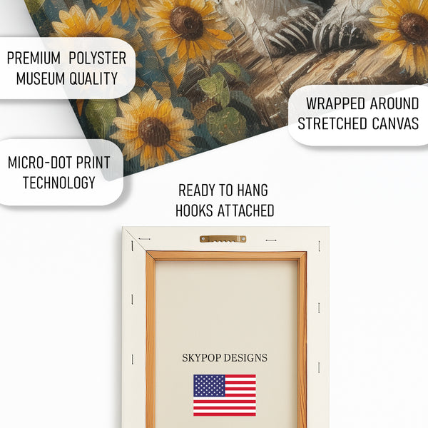 Bring the warmth of a summer day into your home with this charming bear and sunflowers canvas wall art. This delightful poster captures a friendly bear surrounded by vibrant sunflowers, creating a striking and cheerful focal point. The rich yellows of the sunflowers pop against the rustic background, infusing any space with natural beauty and a sense of joy. This animal art piece is perfect for transforming your living room, bedroom, or sunroom into a cozy, inviting retreat. Whether you're aiming for a rustic, farmhouse, or bohemian decor style, this canvas wall art seamlessly enhances your chosen aesthetic. The textured brushstrokes on this poster add a unique depth, making it a captivating addition to your wall decor collection. It's an ideal choice for those looking to add a touch of nature and whimsy, offering a beautiful reminder of sunny days and the outdoors. Looking for a thoughtful housewarming gift or a special birthday present? This bear canvas art is sure to be cherished. Celebrate the simple beauty of nature and the friendly charm of wildlife with this stunning piece. Elevate your home's atmosphere and showcase your love for the outdoors with this unique bear and sunflower artwork. Make this captivating canvas wall art the heart of your decor today.