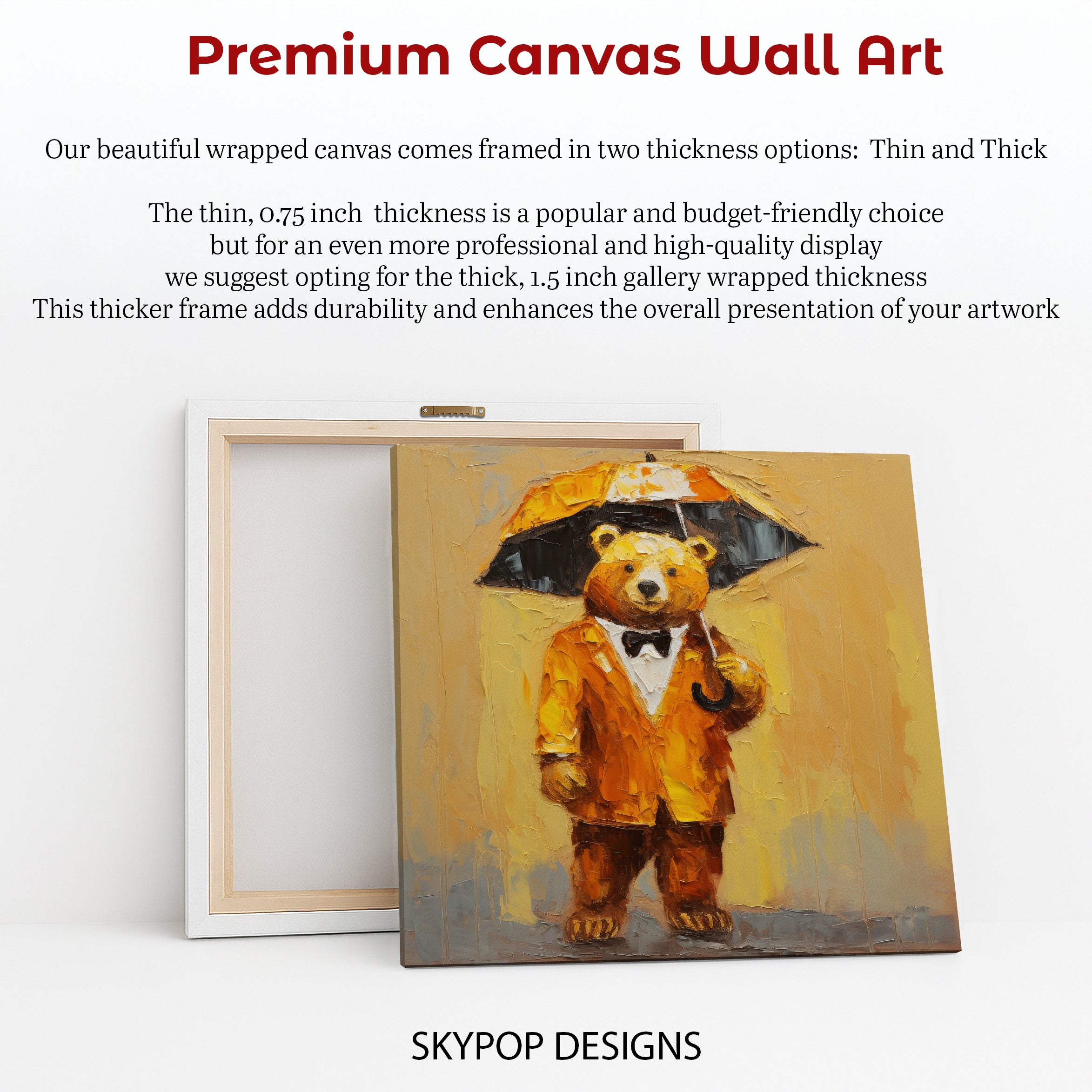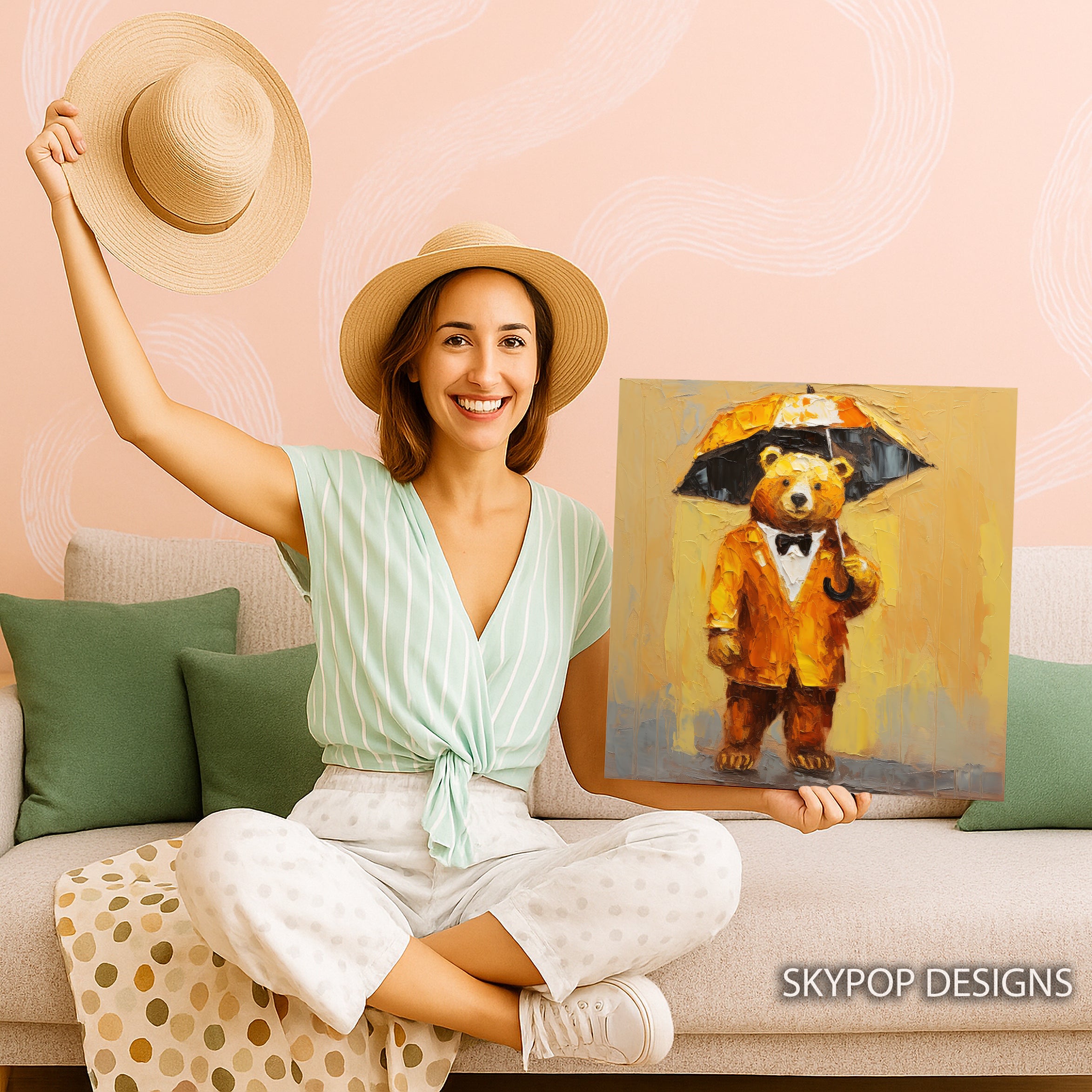 Keywords: Whimsical Art, Animal Art, Contemporary Art, Bohemian Decor, Modern Decor, Contemporary Decor, Living Room Wall Art, Bedroom Decor, Office Art, Kids Room Art, Yellow Decor, Gold Decor, Brown Decor, Multicolor Art, Bear Art, Dapper Bear, Umbrella Art, Canvas Print, Wall Art, Home Decor, Statement Piece, Textured Art, Modern Aesthetic, Bohemian Style, Gift Idea, Housewarming Gift, Birthday Gift, Holiday Gift, Joyful Decor, Elegant Art