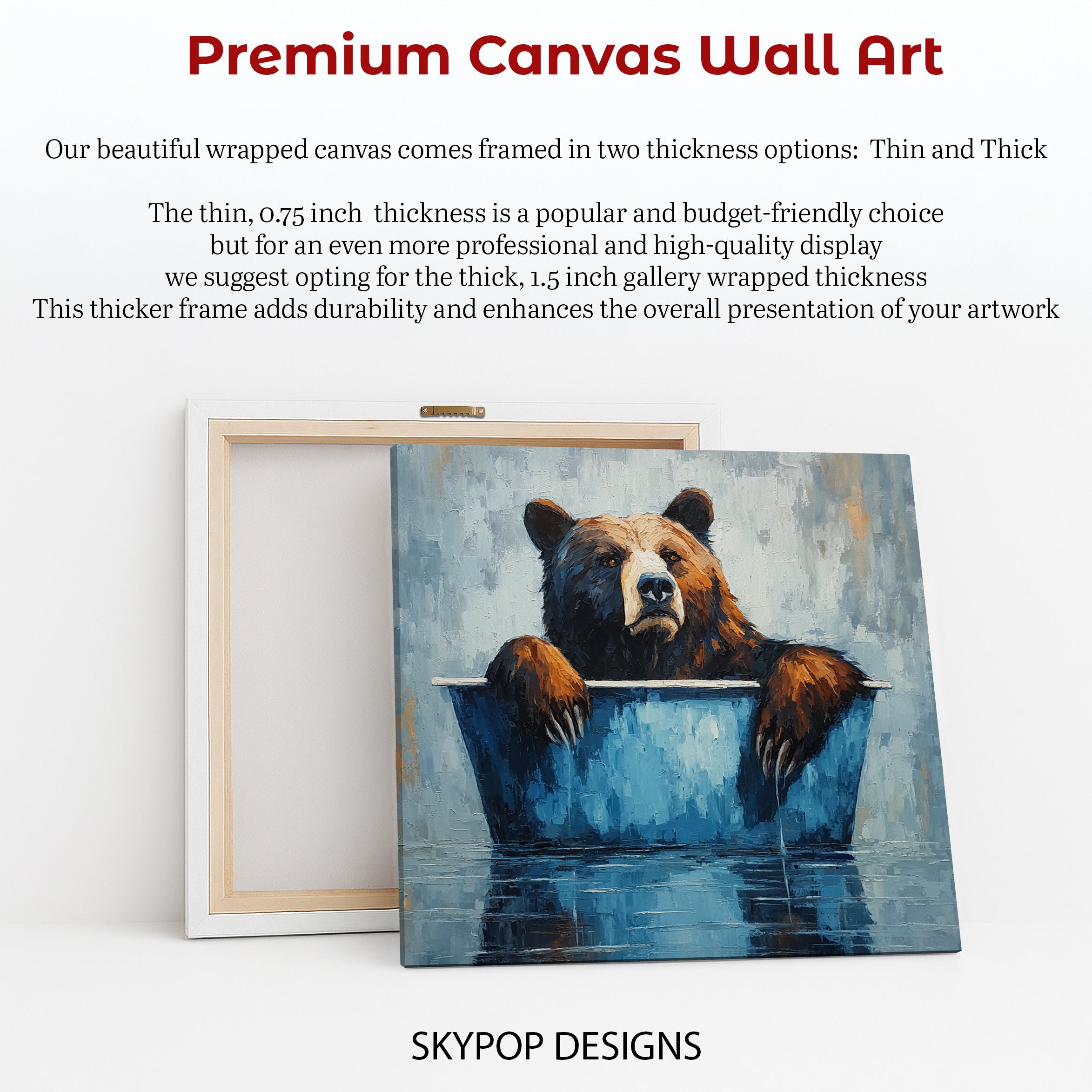 Keywords: bear wall art, animal art, contemporary art, whimsical art, modern decor, bohemian decor, rustic decor, bathroom art, living room art, bedroom art, guest room decor, blue wall art, brown wall art, multicolor art, grey wall art, bear print, canvas wall art, humorous art, charming art, bath time art, relaxing art, textured brushstrokes, wall decor, home decor, housewarming gift, birthday gift, unique wall art, playful art, bear art print, expressive art