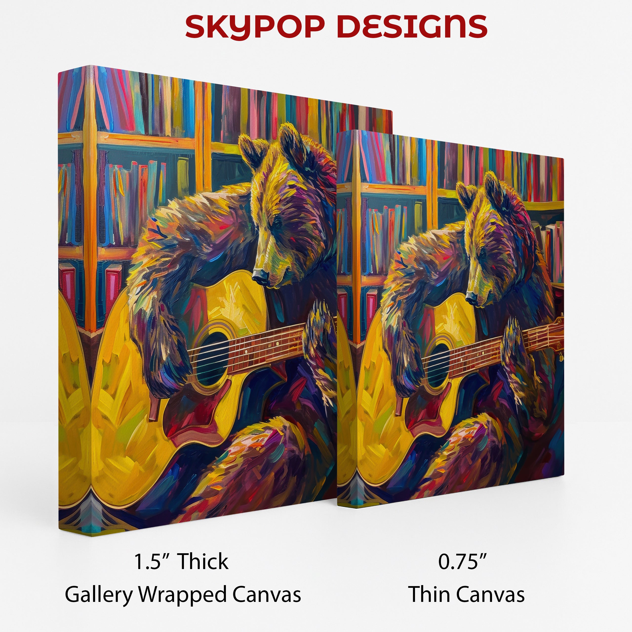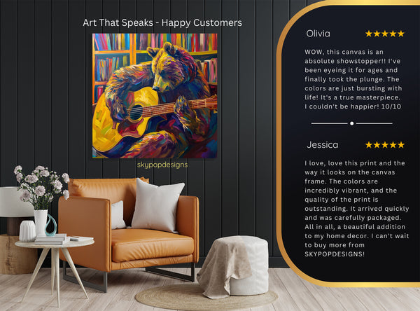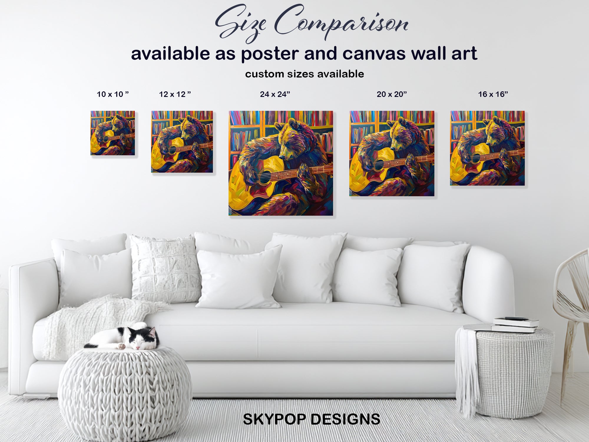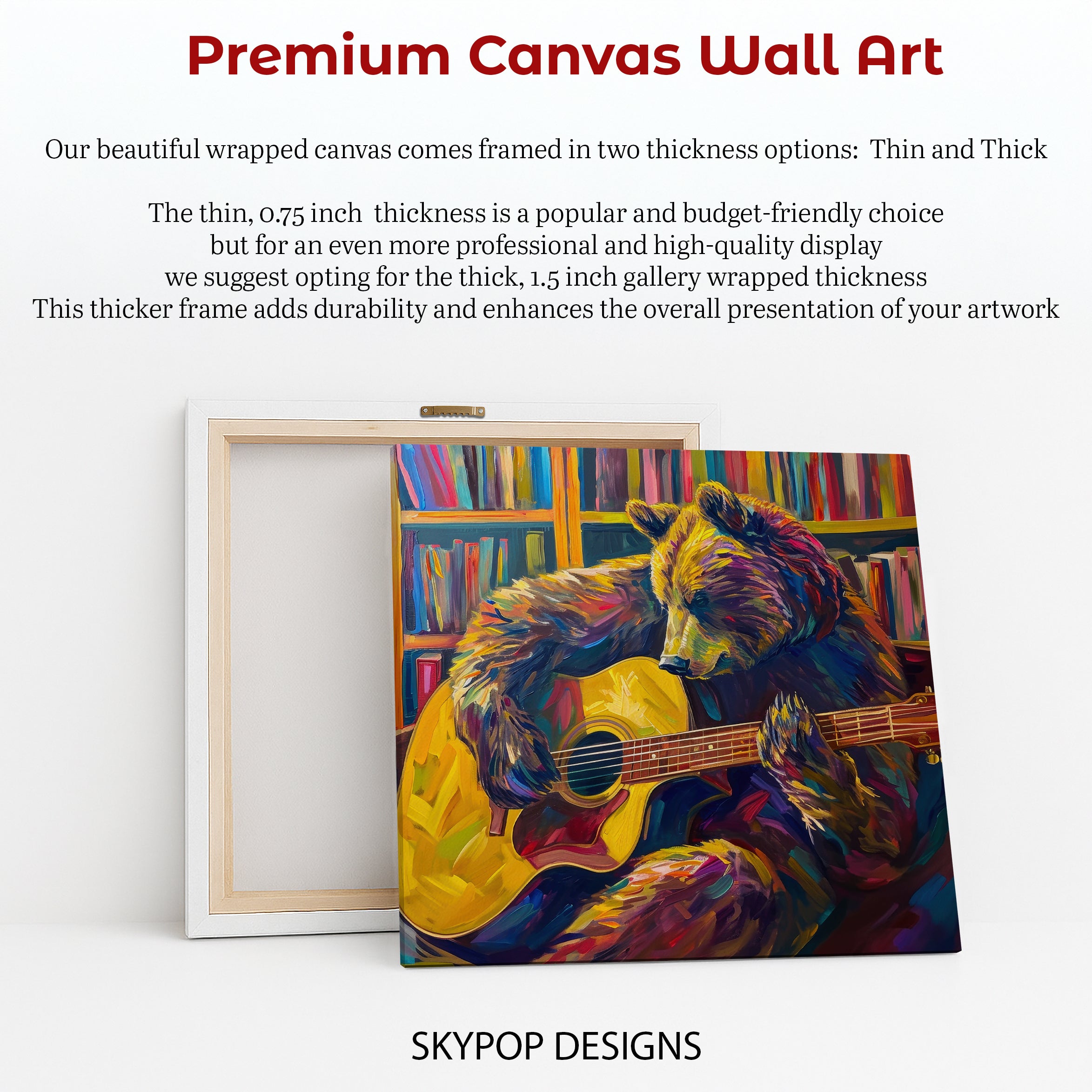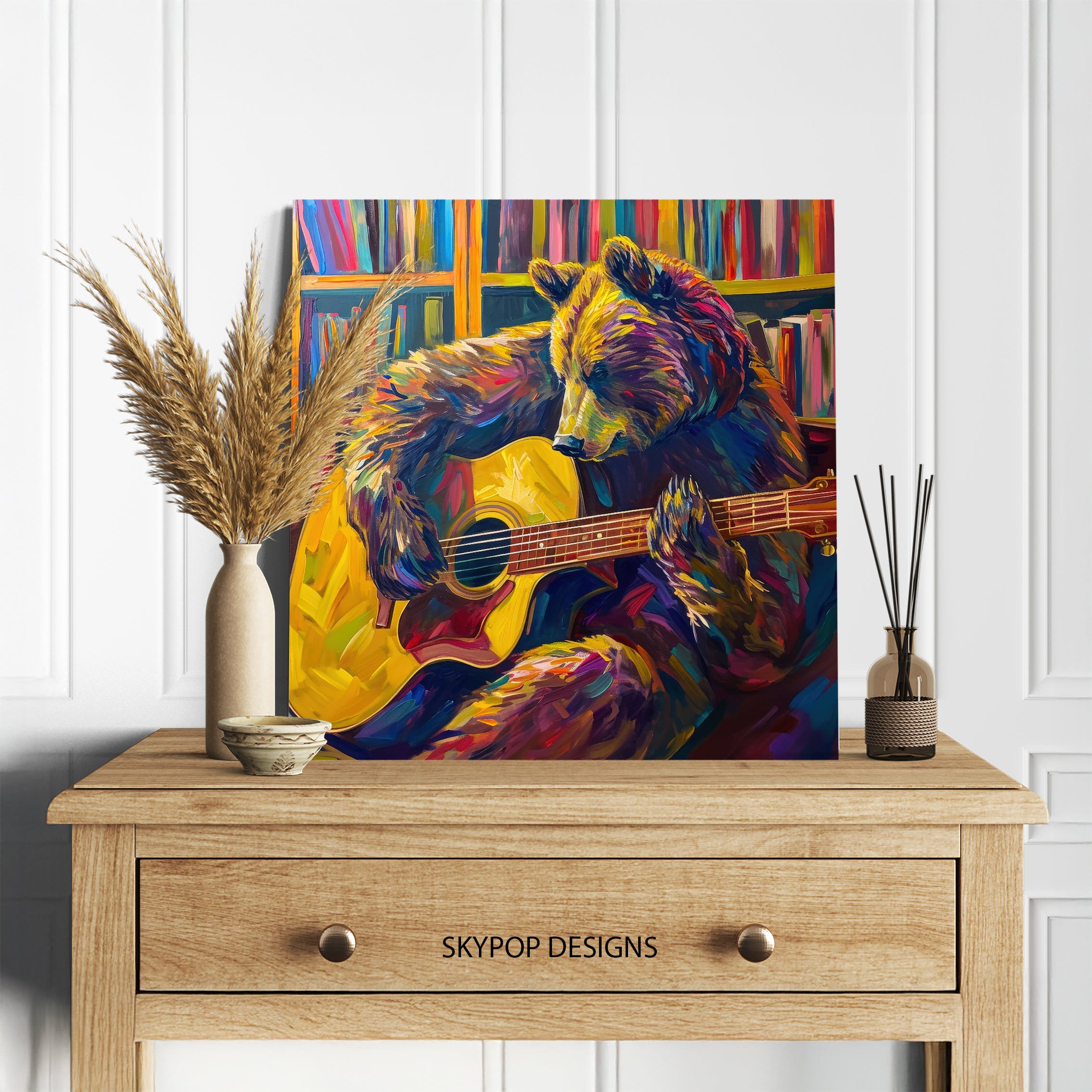 Keywords: Bear Art, Guitar Artwork, Music Lover Gift, Abstract Canvas, Animal Wall Art, Bohemian Decor, Modern Art, Multicolor Art, Yellow Accents, Blue Purple Hues, Living Room Art, Bedroom Decor, Game Room Poster, Office Wall Art, Contemporary Style, Nature Inspired Art, Bear Playing Guitar, Whimsical Art, Colorful Bookshelf, Creative Space Art, Statement Piece, Housewarming Gift, Unique Wall Art, Canvas Print, High Quality Art, Artistic Expression, Vibrant Colors, Home Decor, Music Passion, Bold Strokes