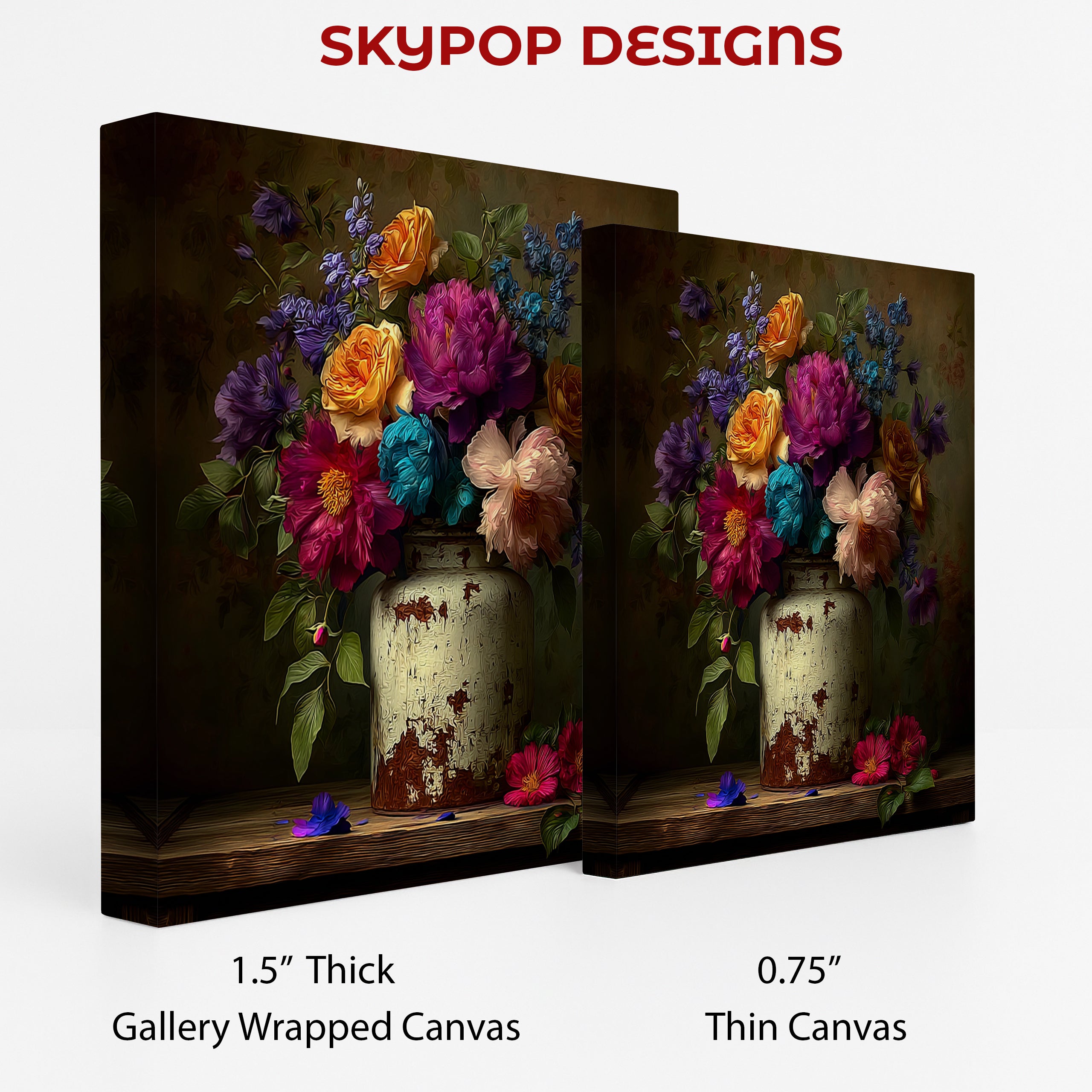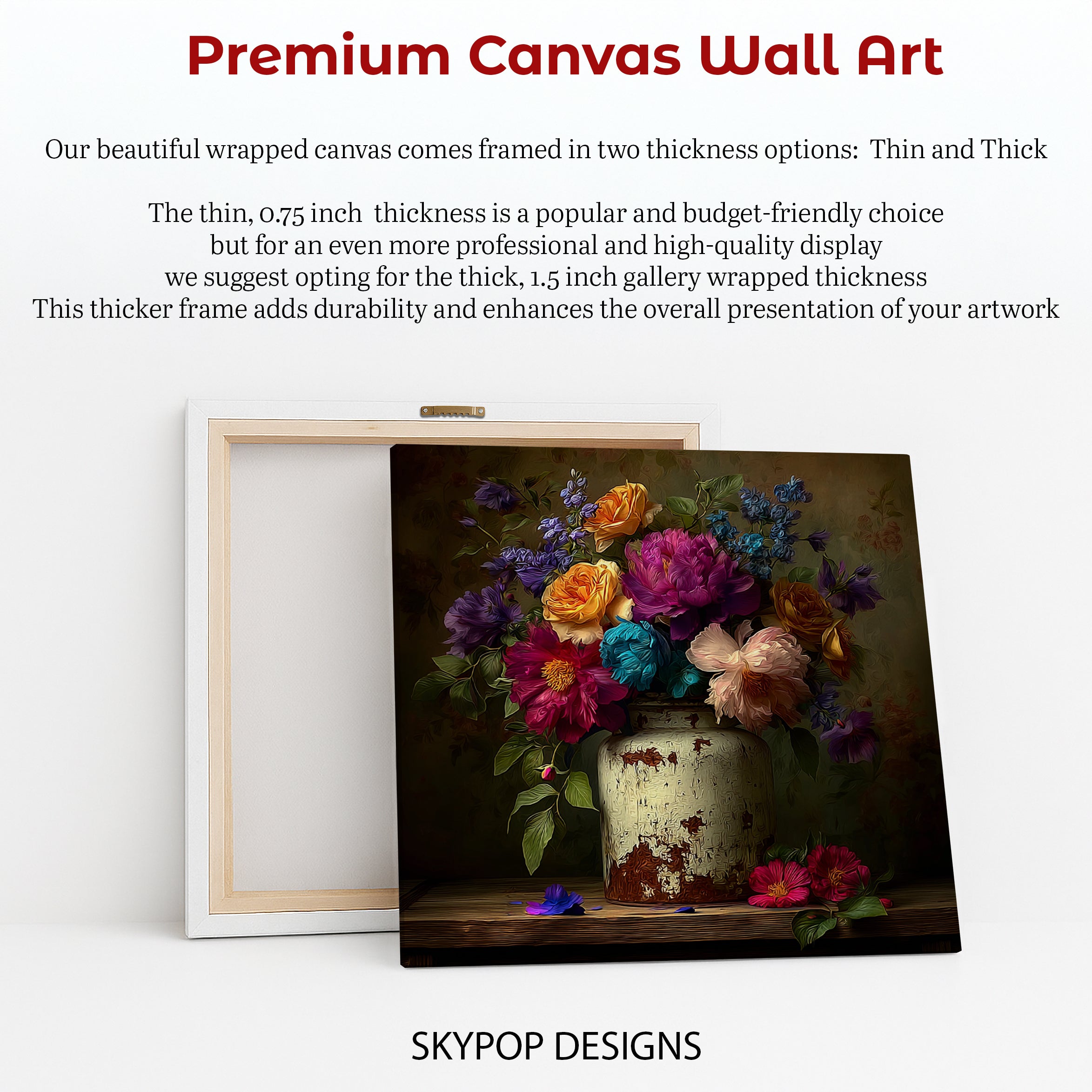 Add a touch of timeless elegance to your home with this stunning floral canvas wall art featuring a vintage vase overflowing with vibrant flowers. This captivating poster or canvas wall art showcases a rich palette of multicolor blooms, including deep reds, sunny yellows, and regal purples, set against a textured, classic background. The traditional style of this artwork makes it a perfect addition to any living room or dining room, creating a warm and inviting atmosphere. The rustic charm of the distressed vase beautifully complements the natural beauty of the floral arrangement, making this a versatile piece for various decor styles. This striking wall art will transform your space, bringing natural splendor and artistic appeal into your home. Ideal for gifting on housewarmings or birthdays, this canvas art is a beautiful way to celebrate life's floral wonders. The detailed depiction of each petal and leaf will inspire and uplift, making it a focal point in any room. Enhance your home decor with this exquisite floral poster, designed to bring lasting beauty and a sense of classic sophistication. High-quality printing ensures vibrant colors and sharp details on every canvas. Elevate your home's ambiance with this breathtaking floral art that speaks of enduring beauty and refined taste. Transform your personal sanctuary with this exceptional canvas art today.